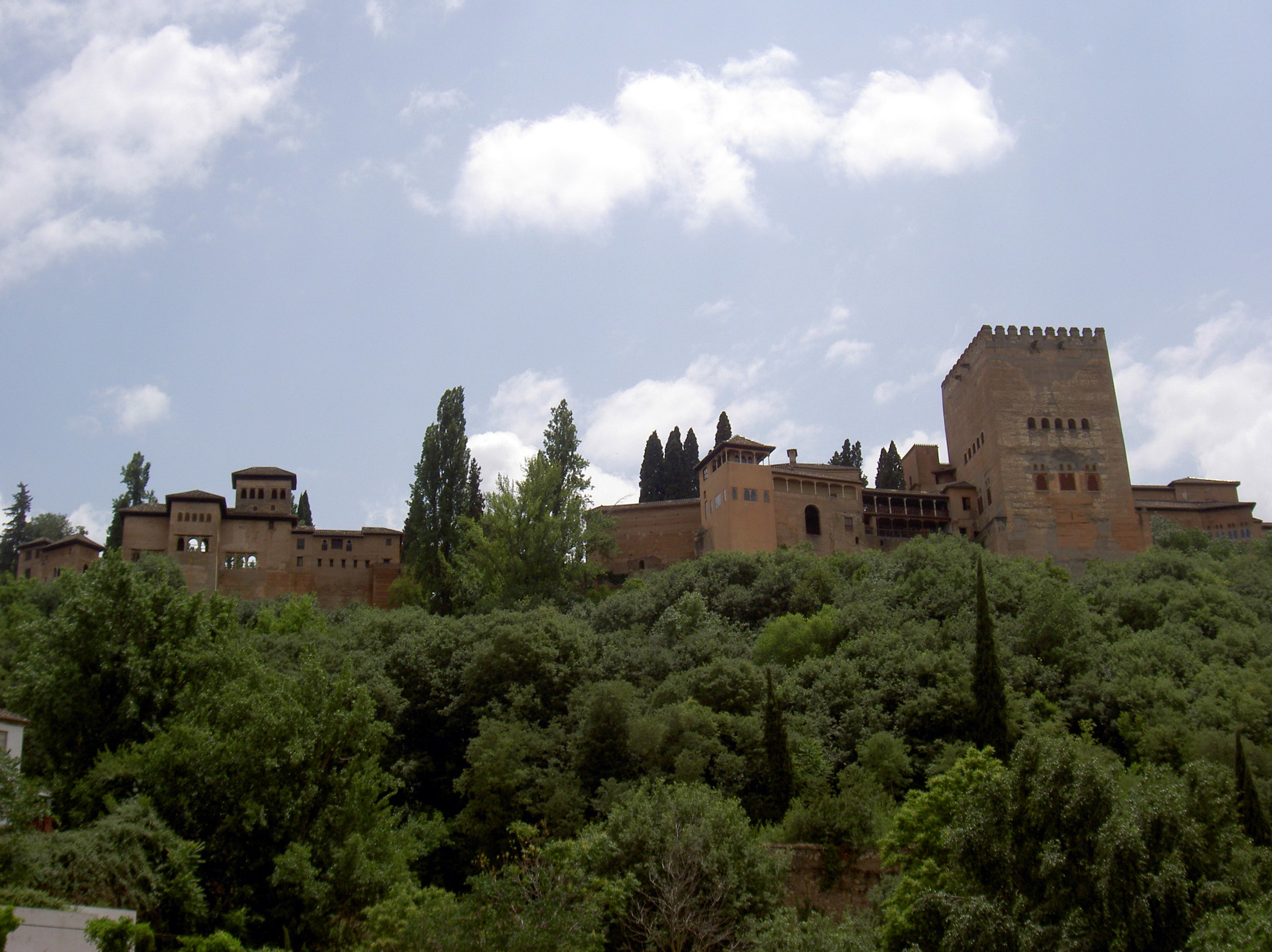 Vista de la Alhambra de Granada desde el paseo de los tristes con el palacio de Comares en primer plano