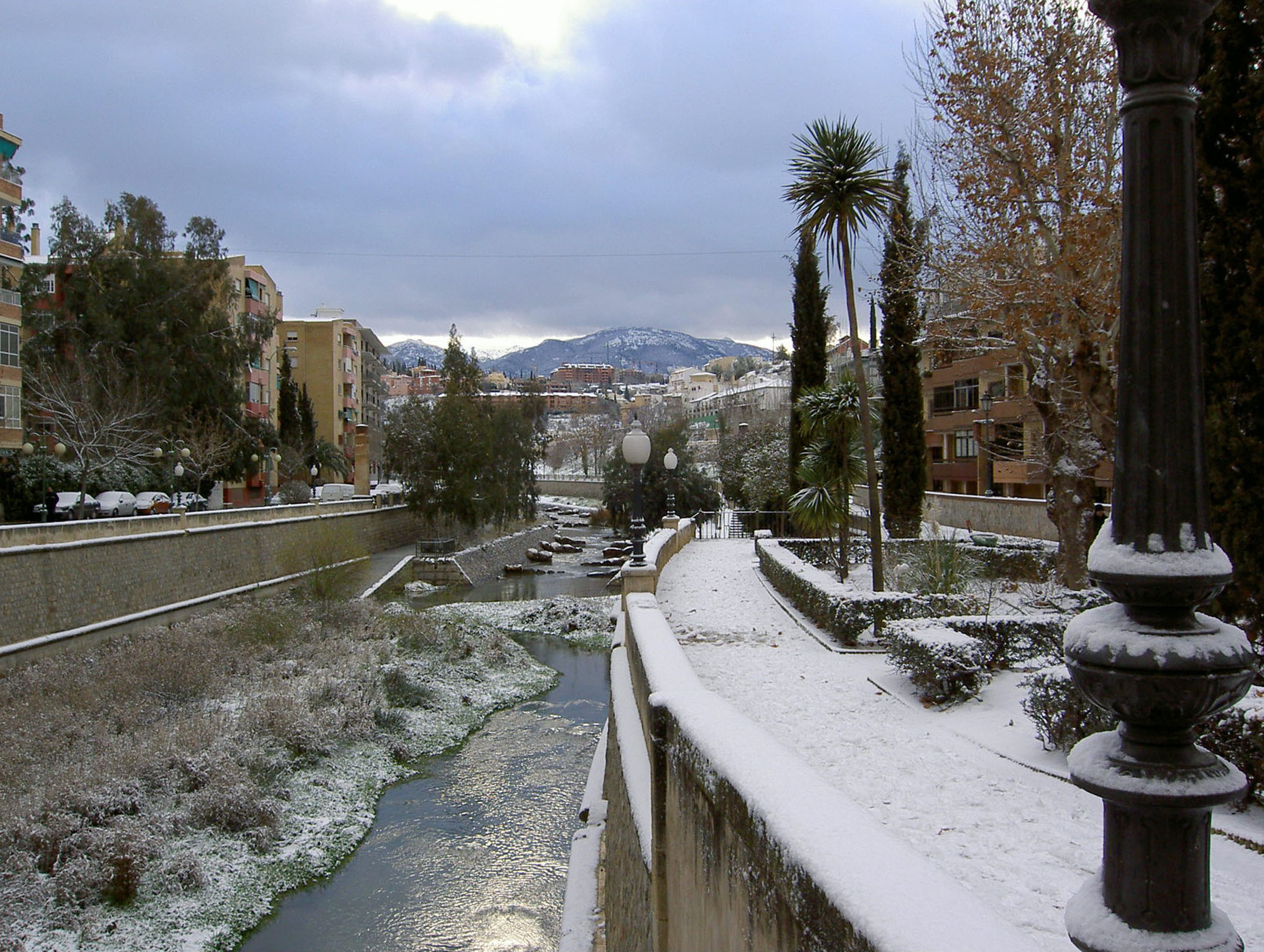 Río Genil y Paseo Fuente de la Bicha, Granada, con nieve.