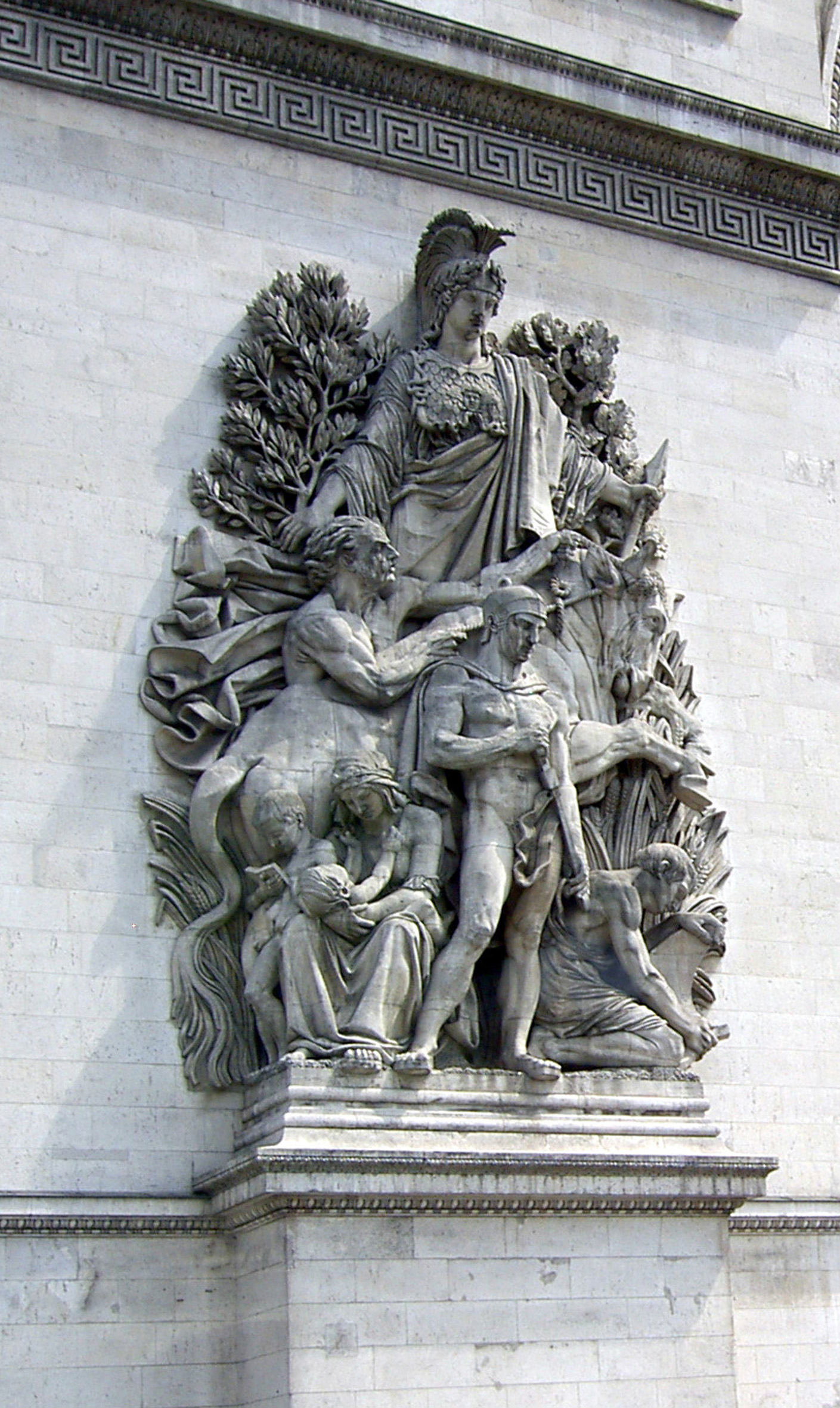 Plano detalle del Arco del Triunfo de París, Francia. Grupo escultórico La Paz o La Paix de 1815, de Antoine Étex, conmemora el Tratado de París.