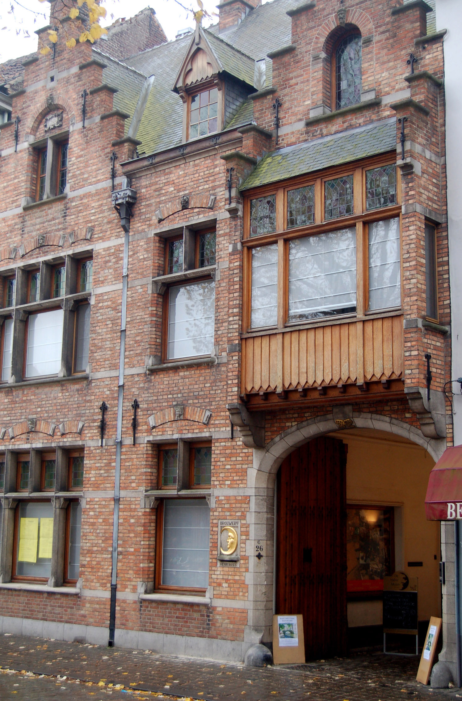Fachada de la Cervecería De Halve Maan en Brujas, Bélgica. Una de las cervecerías artesanales con más historia de toda Bélgica, donde se fabrica artesanalmente la Brugse Zot, la cerveza más conocida y característica de Brujas. Ubicada en un enclave privilegiado entre el Beguinario y la Catedral de San Salvador.