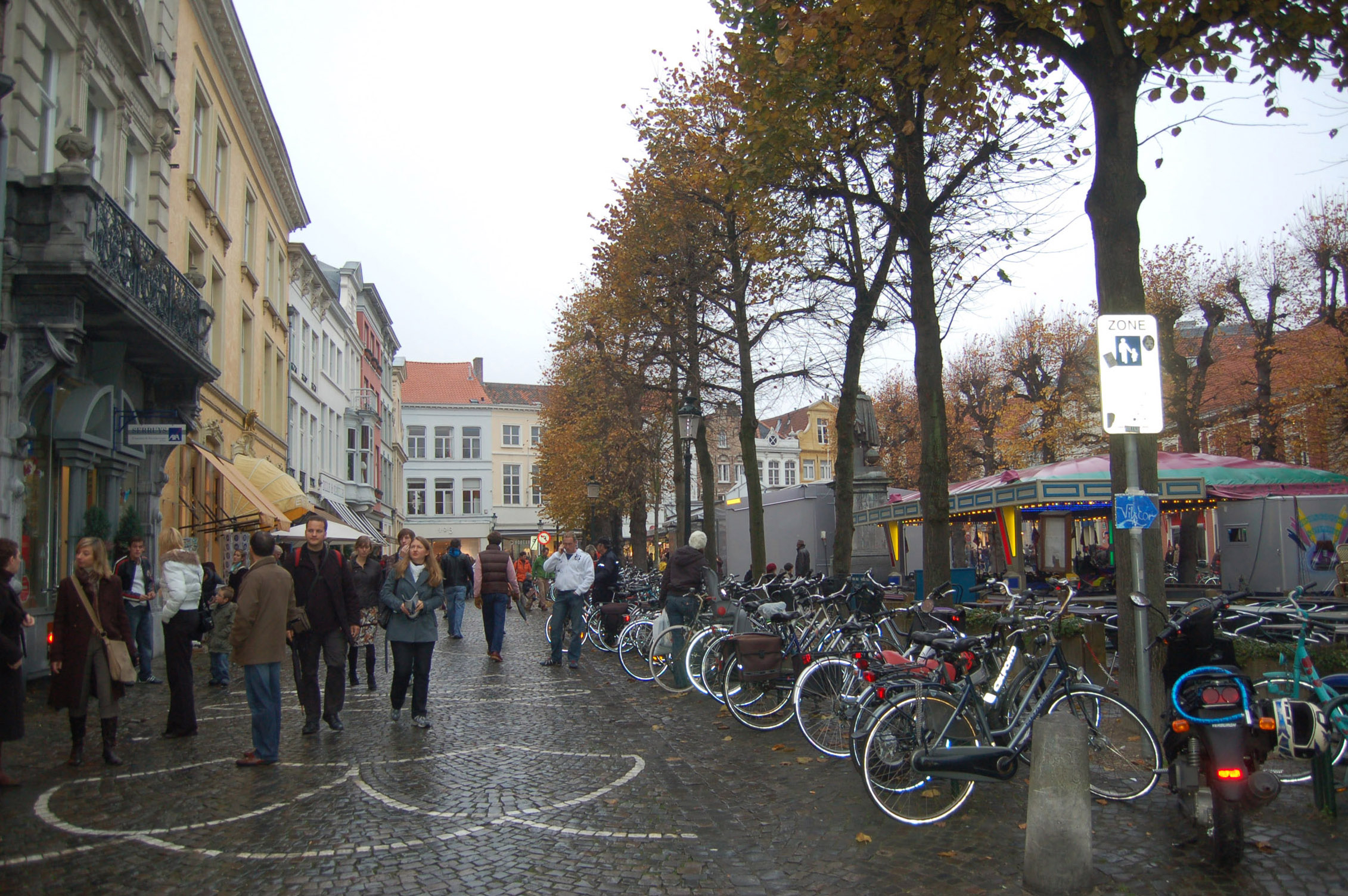Ambiente en el centro histórico de Brujas, Bélgica. Vista de gente paseando, edificios y bicicletas aparcadas.