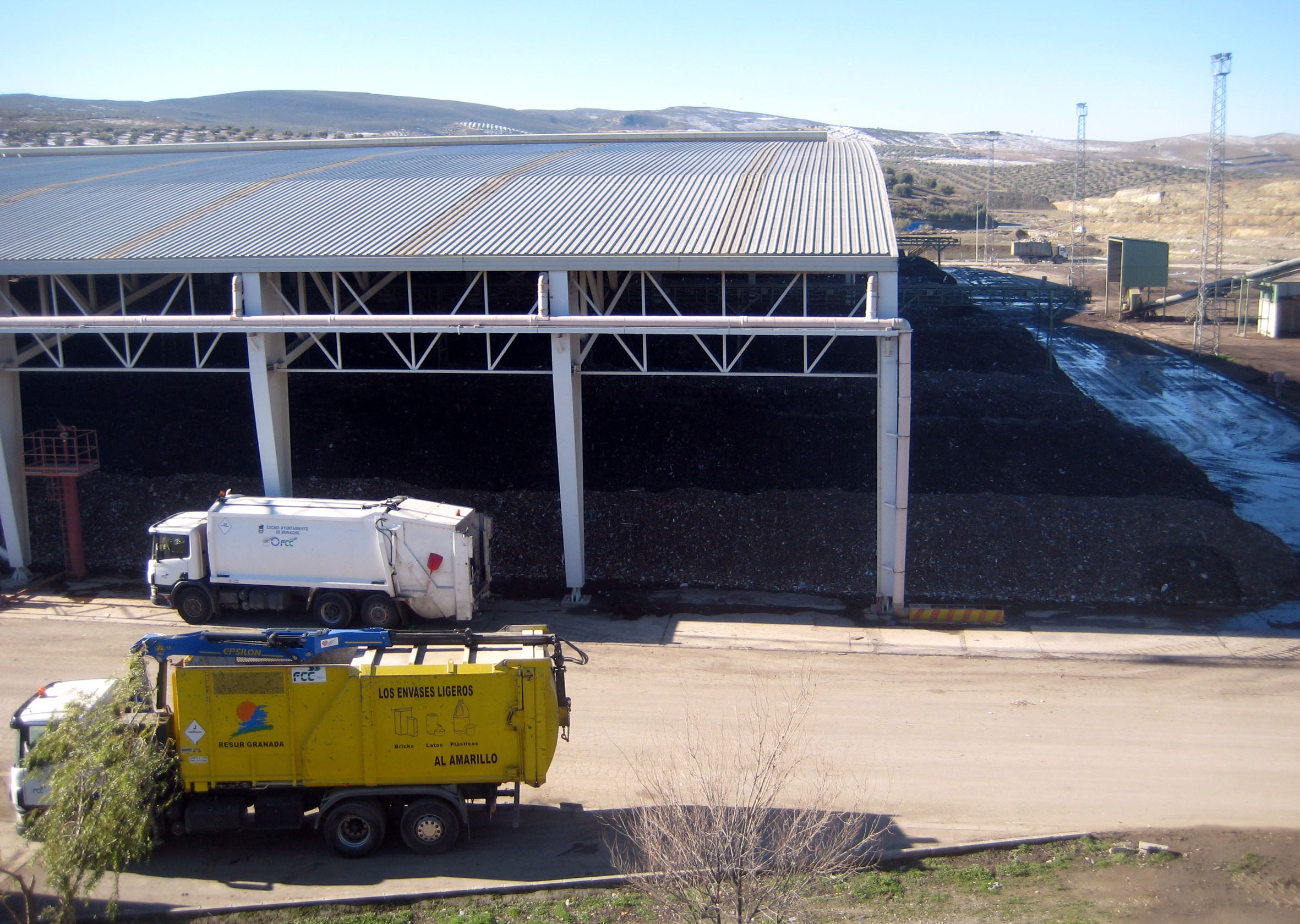 Exterior de la planta de recuperación y compostaje Ecocentral Granada de Alhendín, Granada. Vista nave y camiones de basura.