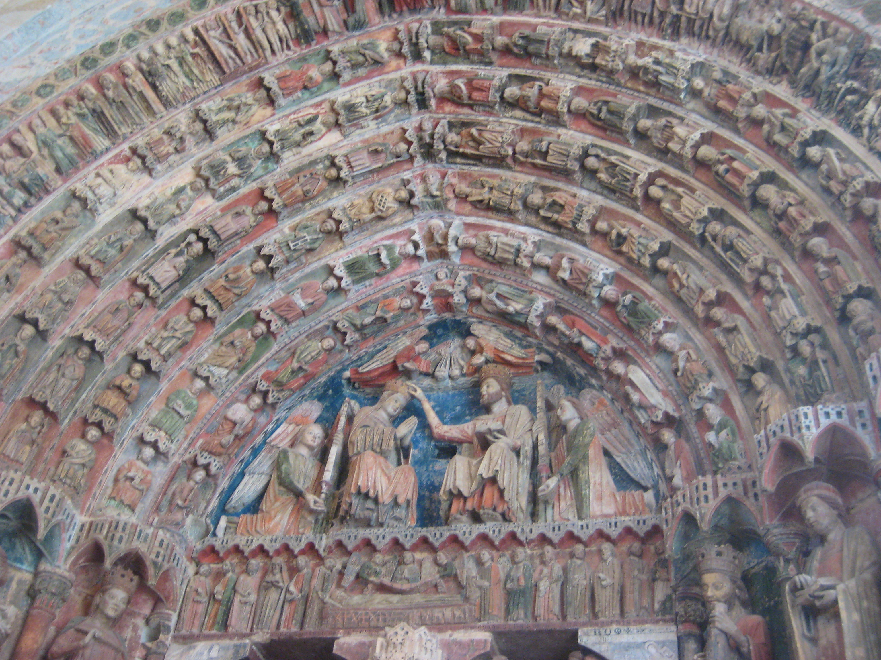 Detalle del tímpano del del pórtico policromado de la Colegiata de Santa María la Mayor en Toro, Zamora.