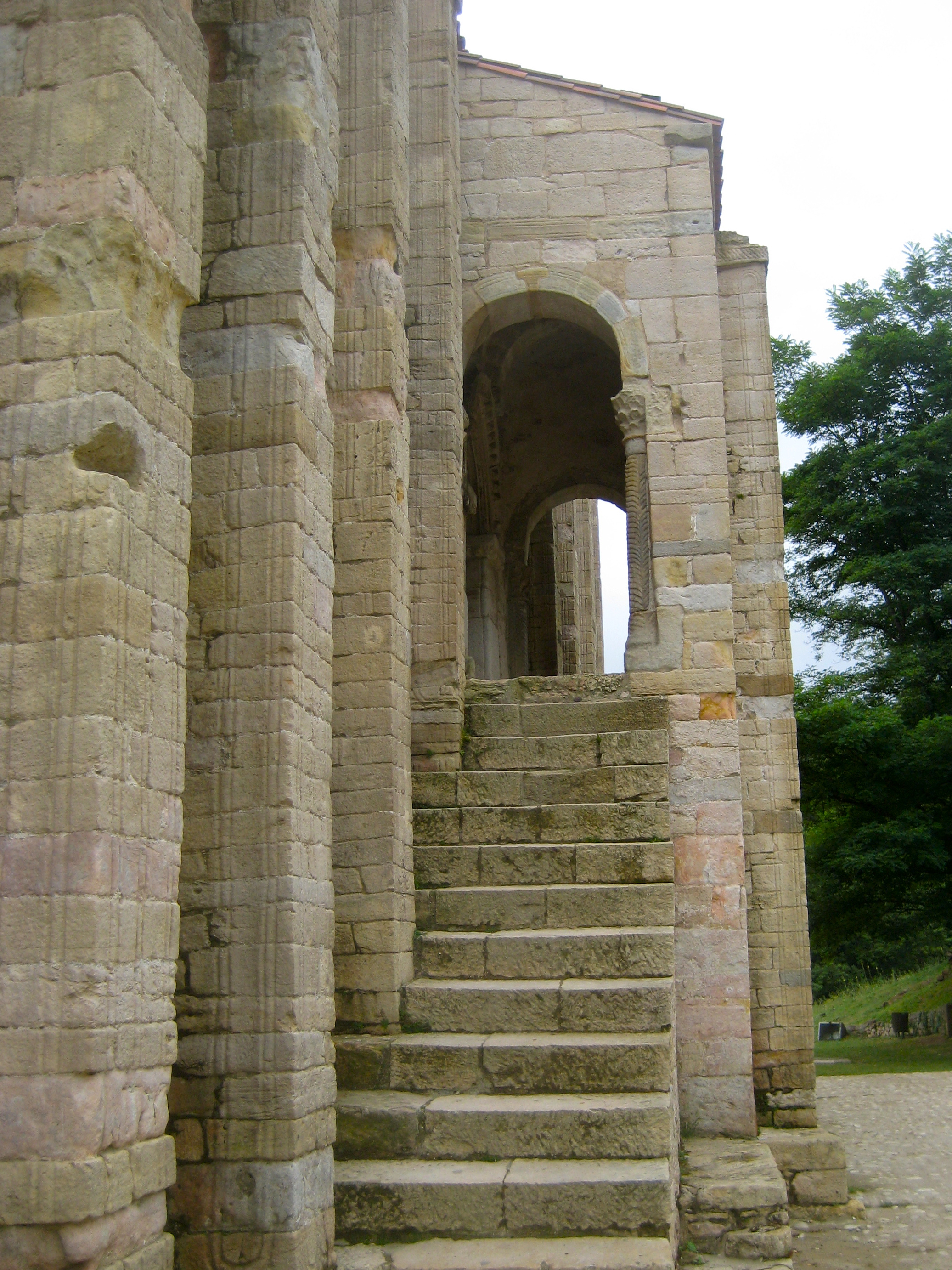 Iglesia de Santa María del Naranco en Oviedo. Vista de escaleras y puerta de acceso.