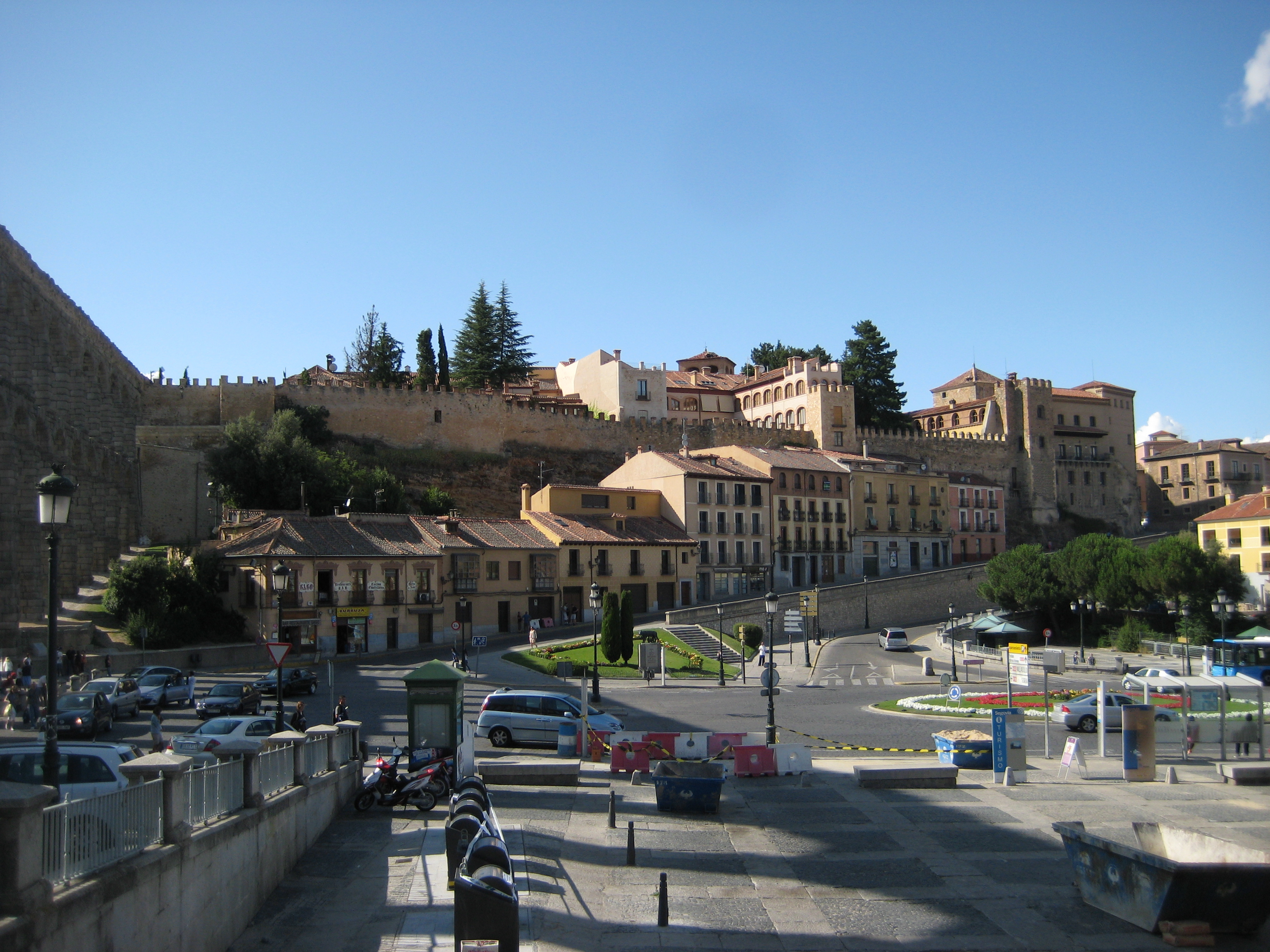 Plaza de la Artillería de Segovia. Vista de la plaza, edificios y coches aparcados.