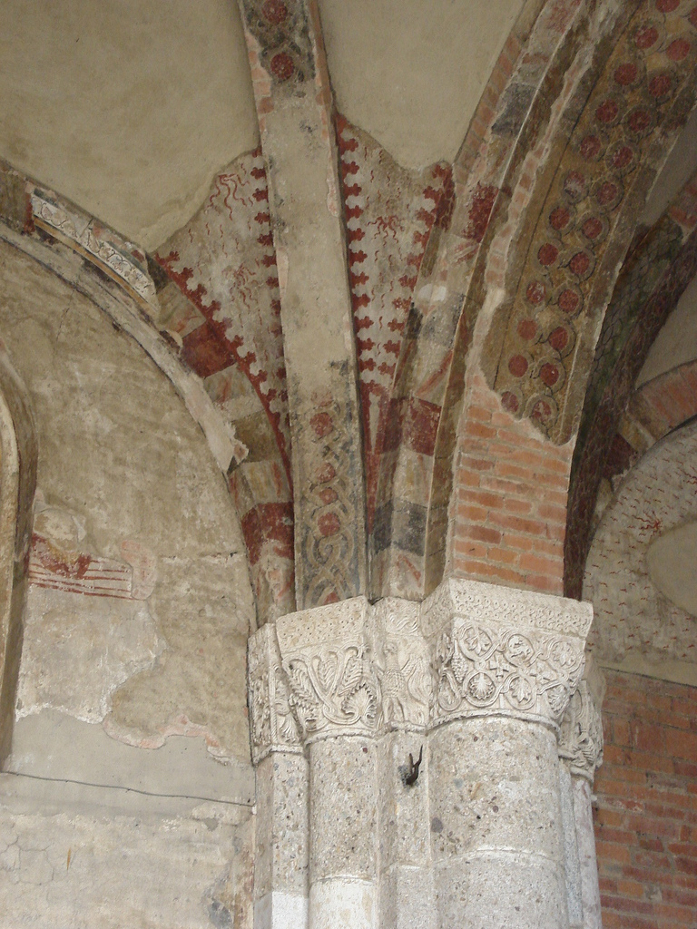Interior de la Basílica de San Ambrosio en Milán. Vista parcial arco de crucería y y capitel de una columna.