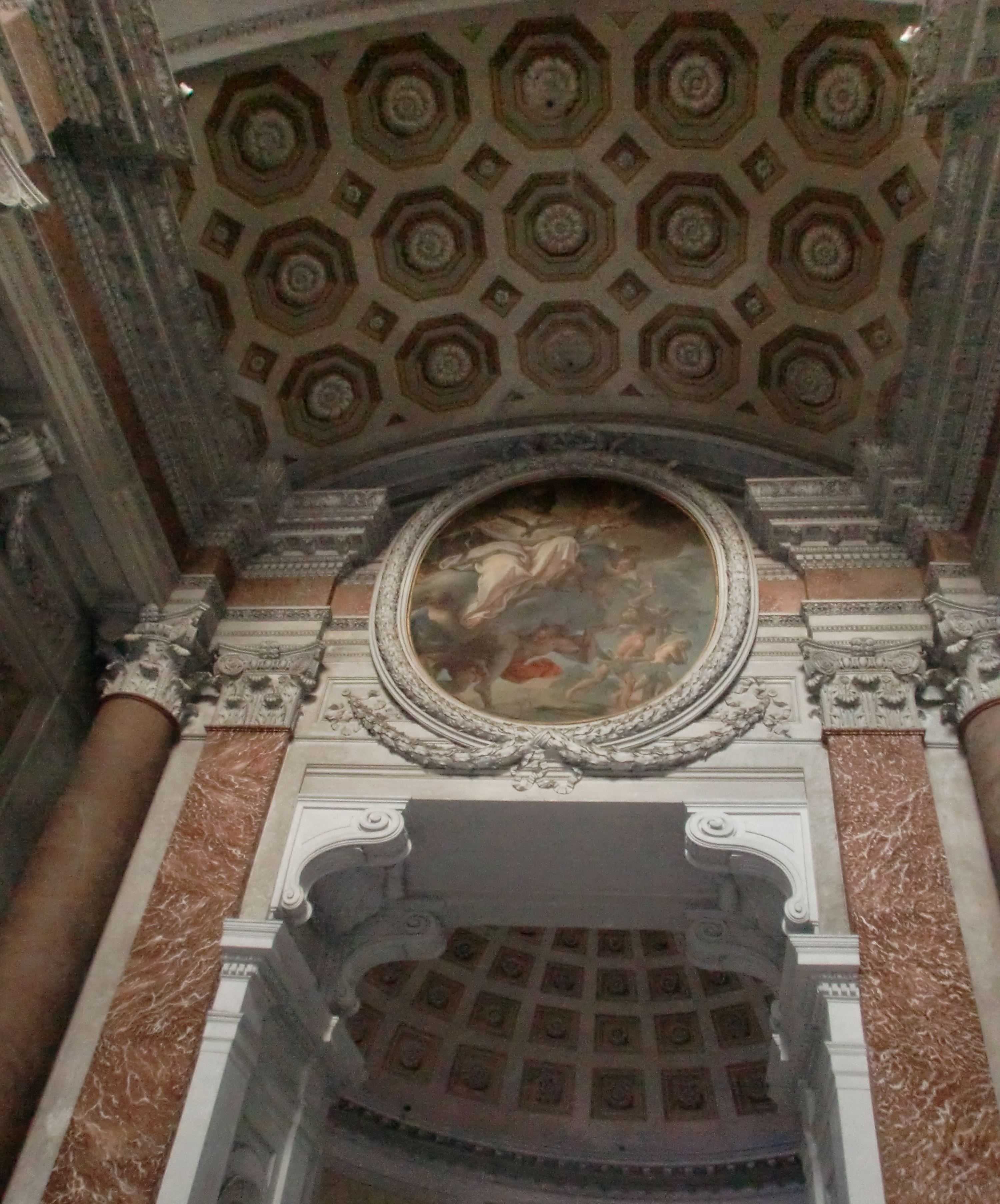 Interior Basílica de Santa María de Los Ángeles y Los Mártires, Roma (Italia). Plano contrapicado techo y frescos.
