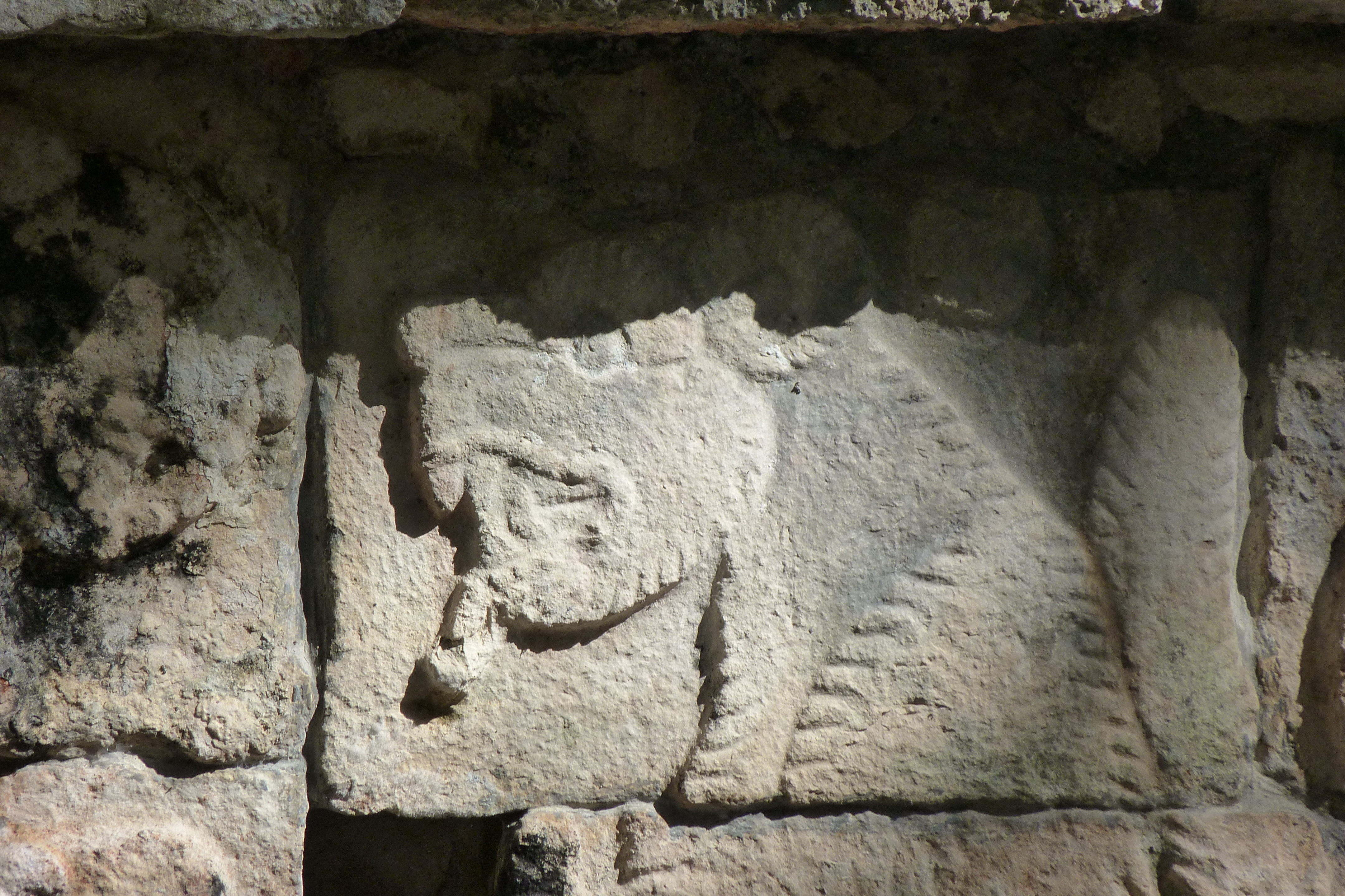 Relieve con figura de jaguar en el Templo de las mil columnas. El Templo de Las Mil Columnas o Templo de los Guerreros es una construcción de la época maya posclásica, compuesta de múltiples columnas agrupadas en un vasto cuadrilátero. En el lado oeste se pueden ver los restos de cuatro cámaras, dos de las cuales fueron rellenadas para sostener un segundo piso. Las columnas fueron construidas entre el 900 d.C. y el 1200 d.C por los mayas itzáes en la antigua ciudad de Chichén Itzá, en el territorio actualmente perteneciente al estado mexicano de Yucatán, y muestran los restos de revestimiento de estuco, que habría sido pintado en diferentes colores.