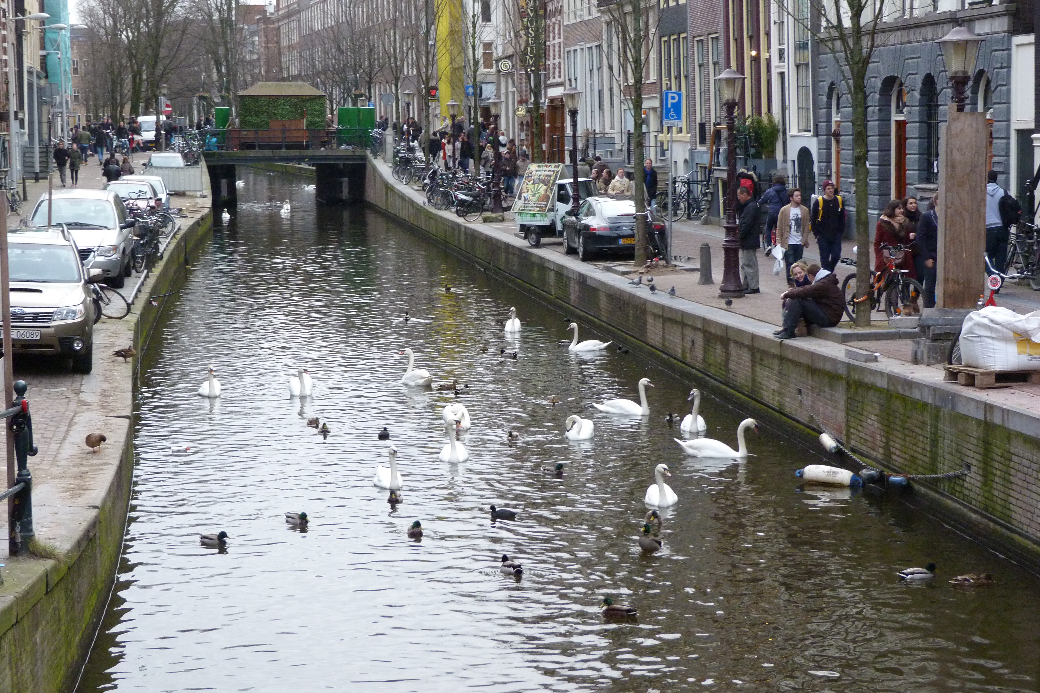 Canal, patos y cisnes en Ámsterdam
