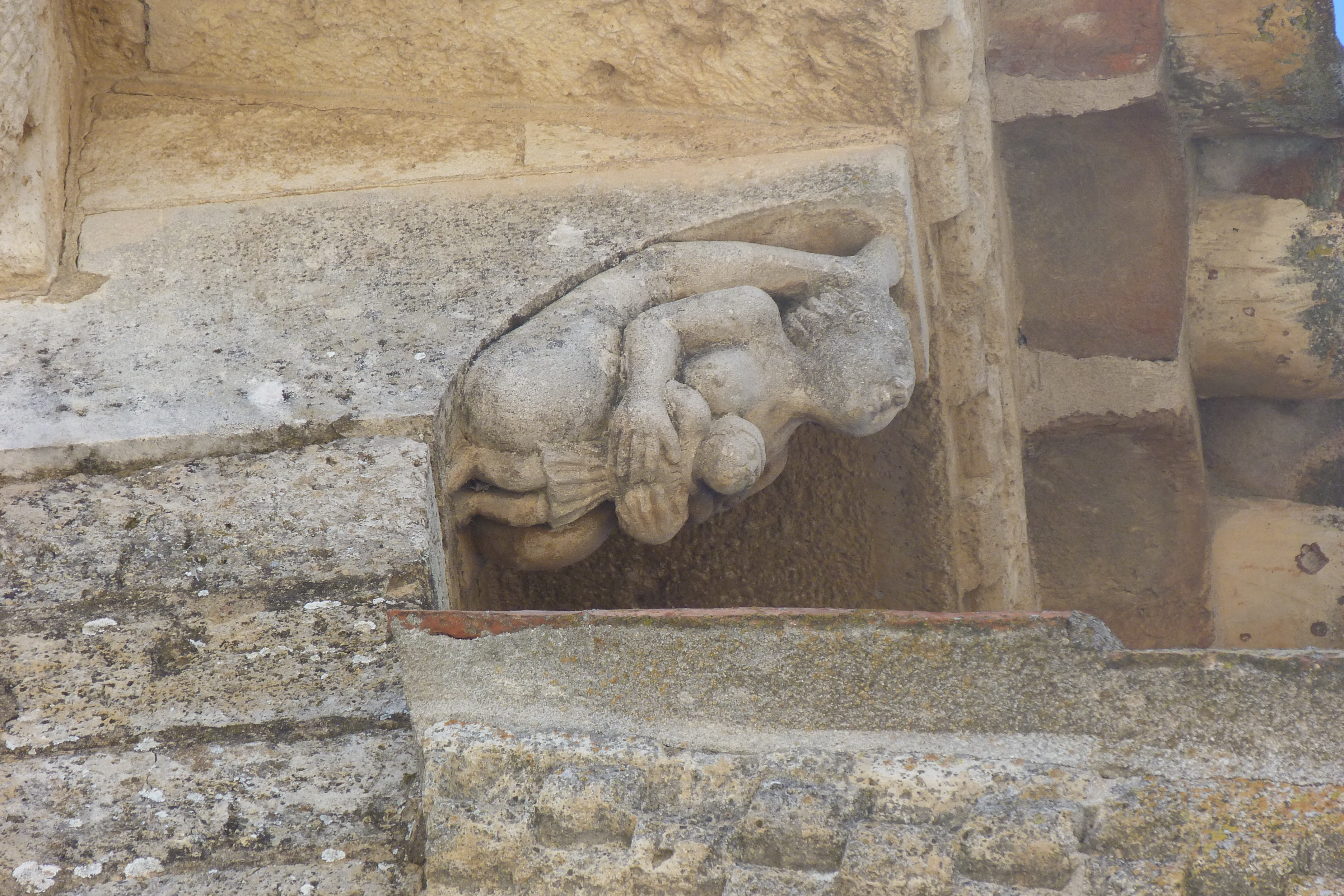 El exterior de la iglesia, aunque en general sobrio, tiene algunos elementos decorativos de interés. Destacan los capiteles con imágenes vegetales, animales o narrativas. Entre ellos merece la pena observar con detenimiento los dedicados a la historia de Adán y Eva, o a la fábula de "La zorra y el cuervo".