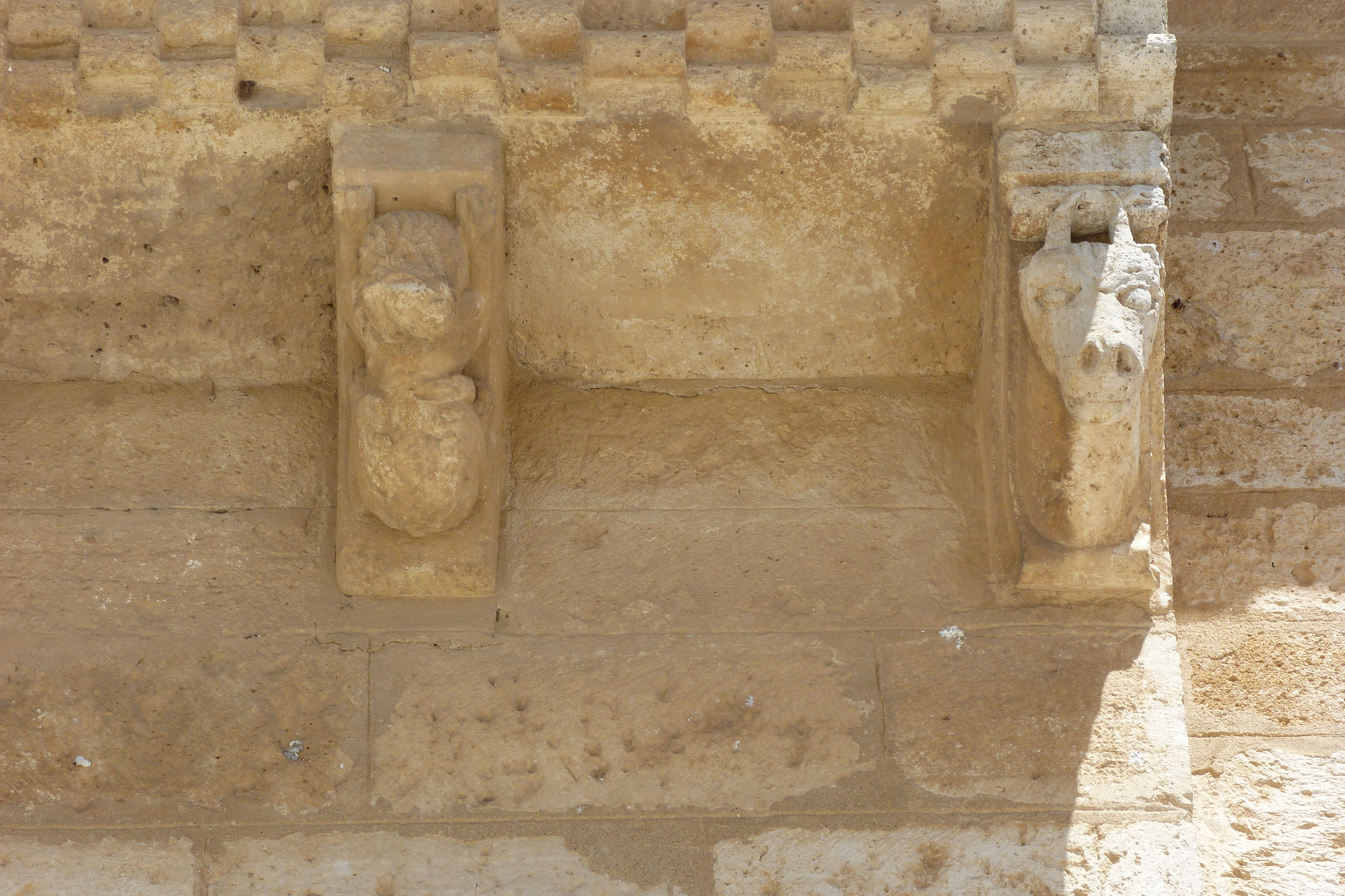El exterior de la iglesia, aunque en general sobrio, tiene algunos elementos decorativos de interés. Destacan los capiteles con imágenes vegetales, animales o narrativas. Entre ellos merece la pena observar con detenimiento los dedicados a la historia de Adán y Eva, o a la fábula de "La zorra y el cuervo".