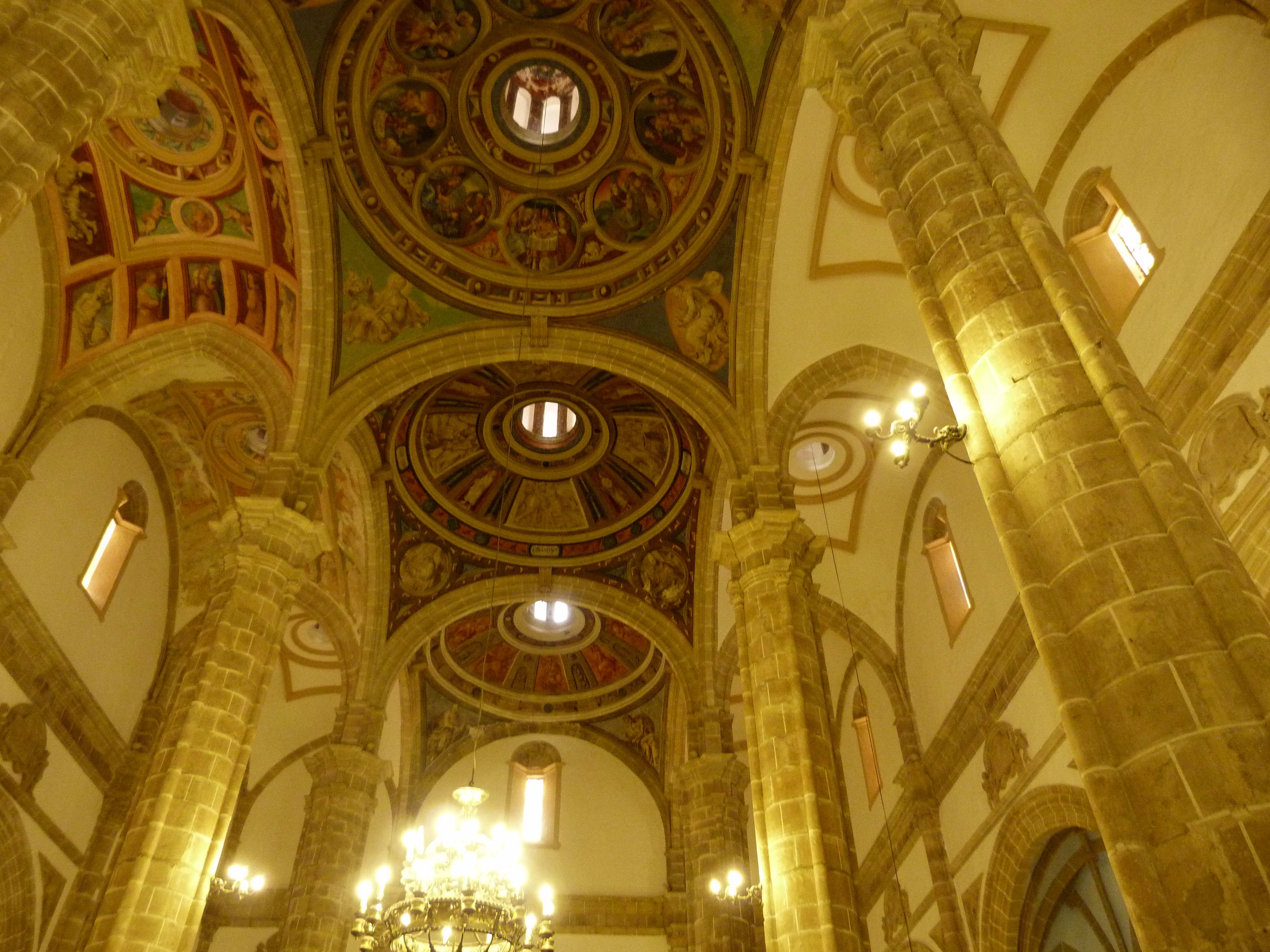 El espacio interior es de planta basilical con tres naves. Pilares cilíndricos y columnas adosadas dividen las naves. La nave central está cubierta por cúpulas de media naranja con linternas sobre pechinas, mientras que las laterales tienen bóvedas vaídas rectangulares. Capillas-hornacinas se abren entre los contrafuertes en los muros laterales.