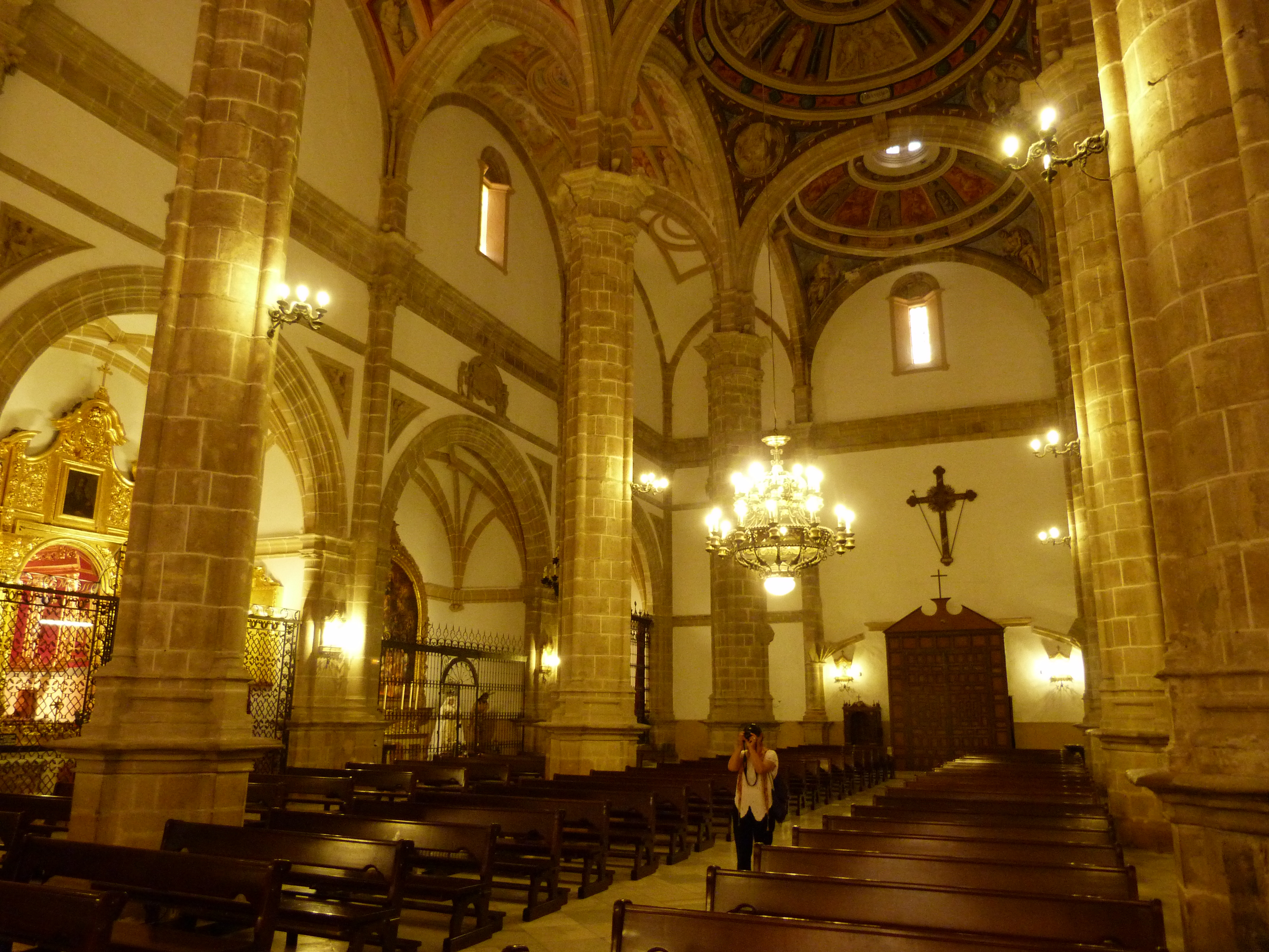 El espacio interior es de planta basilical con tres naves. Pilares cilíndricos y columnas adosadas dividen las naves. La nave central está cubierta por cúpulas de media naranja con linternas sobre pechinas, mientras que las laterales tienen bóvedas vaídas rectangulares. Capillas-hornacinas se abren entre los contrafuertes en los muros laterales.
