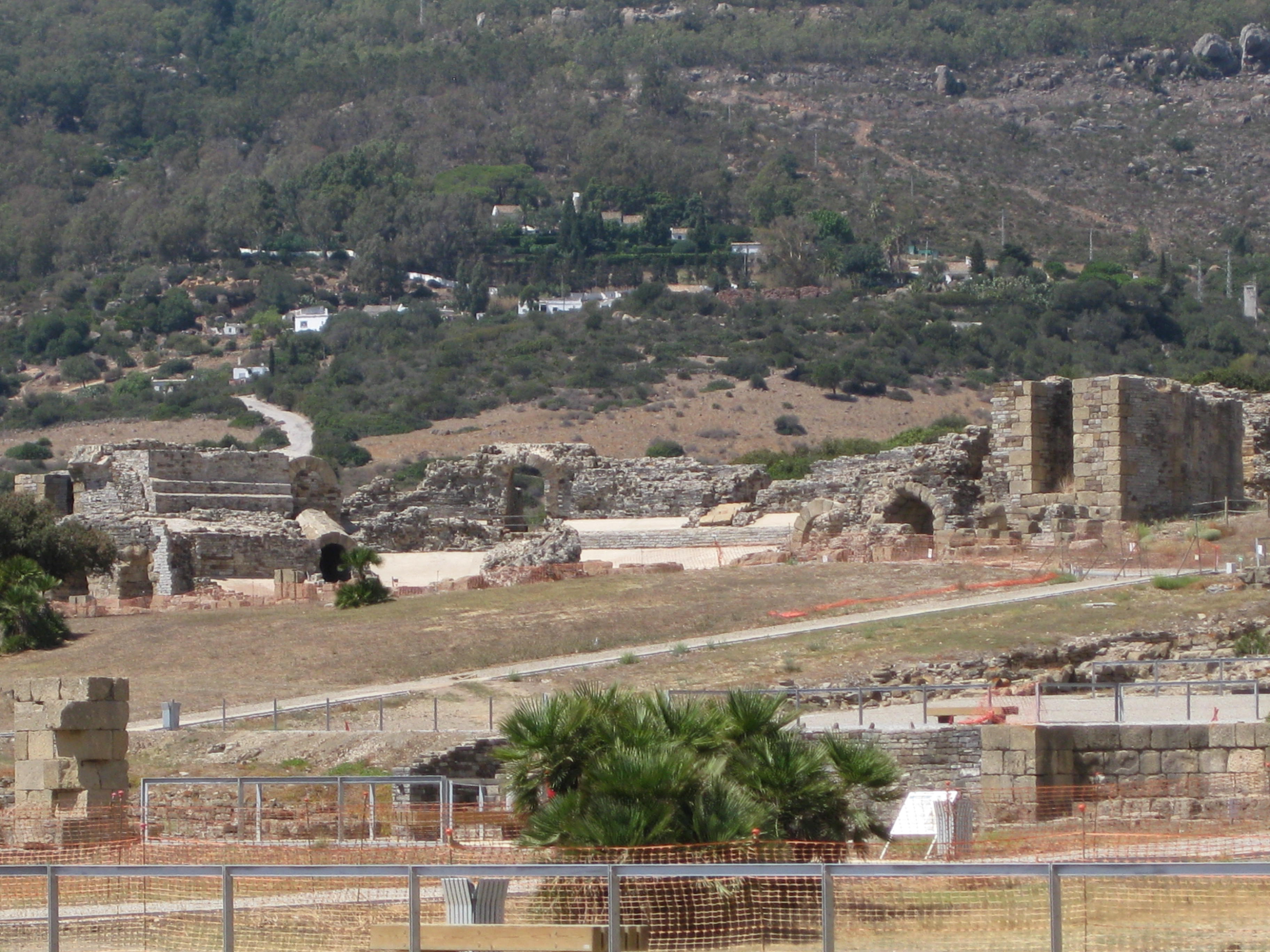 Restos del teatro de Baelo Claudia. Baelo Claudia fue una ciudad romana situada en la ensenada de Bolonia, en la actual población de Bolonia, a unos 22 km al noroeste de la ciudad de Tarifa, en la provincia de Cádiz (España). Se encuentra dentro del actual parque natural del Estrecho. El estudio de sus restos arquitectónicos muestra su origen romano a finales del siglo ii a. C., observándose ya desde esa época una gran riqueza que la convierte en un centro económico importante dentro del área del Mediterráneo. Bien de Interés Cultural, su publicación como Monumento apareció en La Gaceta de Madrid, en 1925.