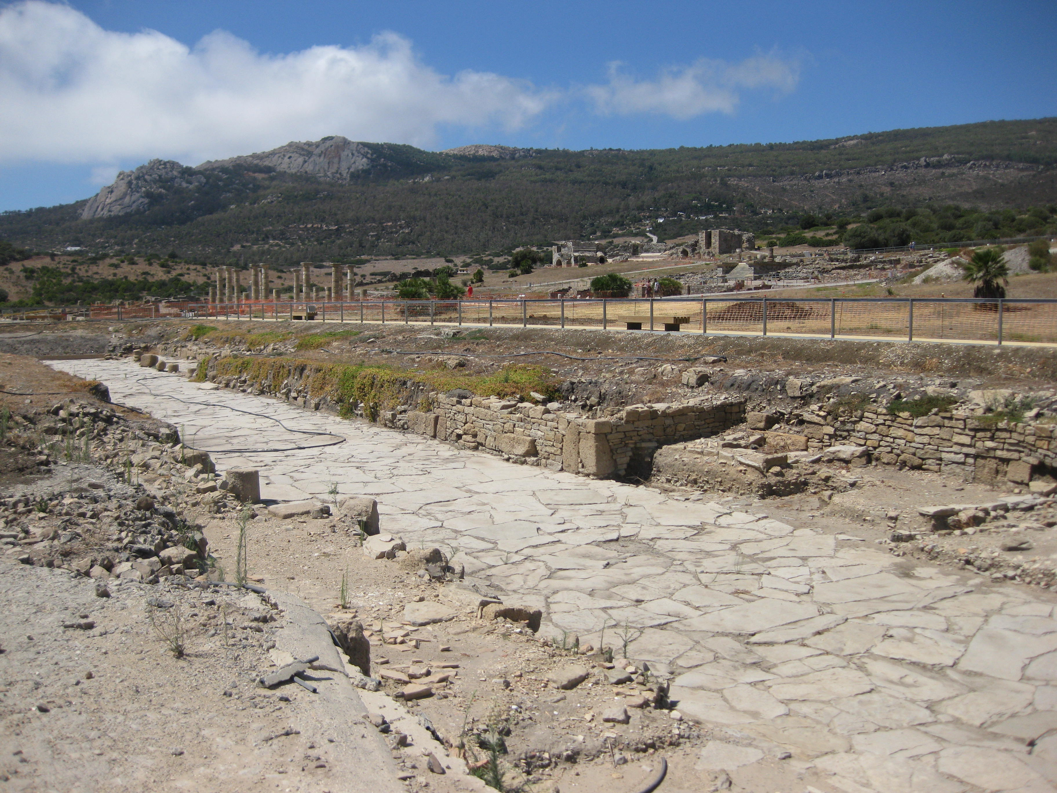 Vía principal de Baelo Claudia. Baelo Claudia fue una ciudad romana situada en la ensenada de Bolonia, en la actual población de Bolonia, a unos 22 km al noroeste de la ciudad de Tarifa, en la provincia de Cádiz (España). Se encuentra dentro del actual parque natural del Estrecho. El estudio de sus restos arquitectónicos muestra su origen romano a finales del siglo ii a. C., observándose ya desde esa época una gran riqueza que la convierte en un centro económico importante dentro del área del Mediterráneo. Bien de Interés Cultural, su publicación como Monumento apareció en La Gaceta de Madrid, en 1925.