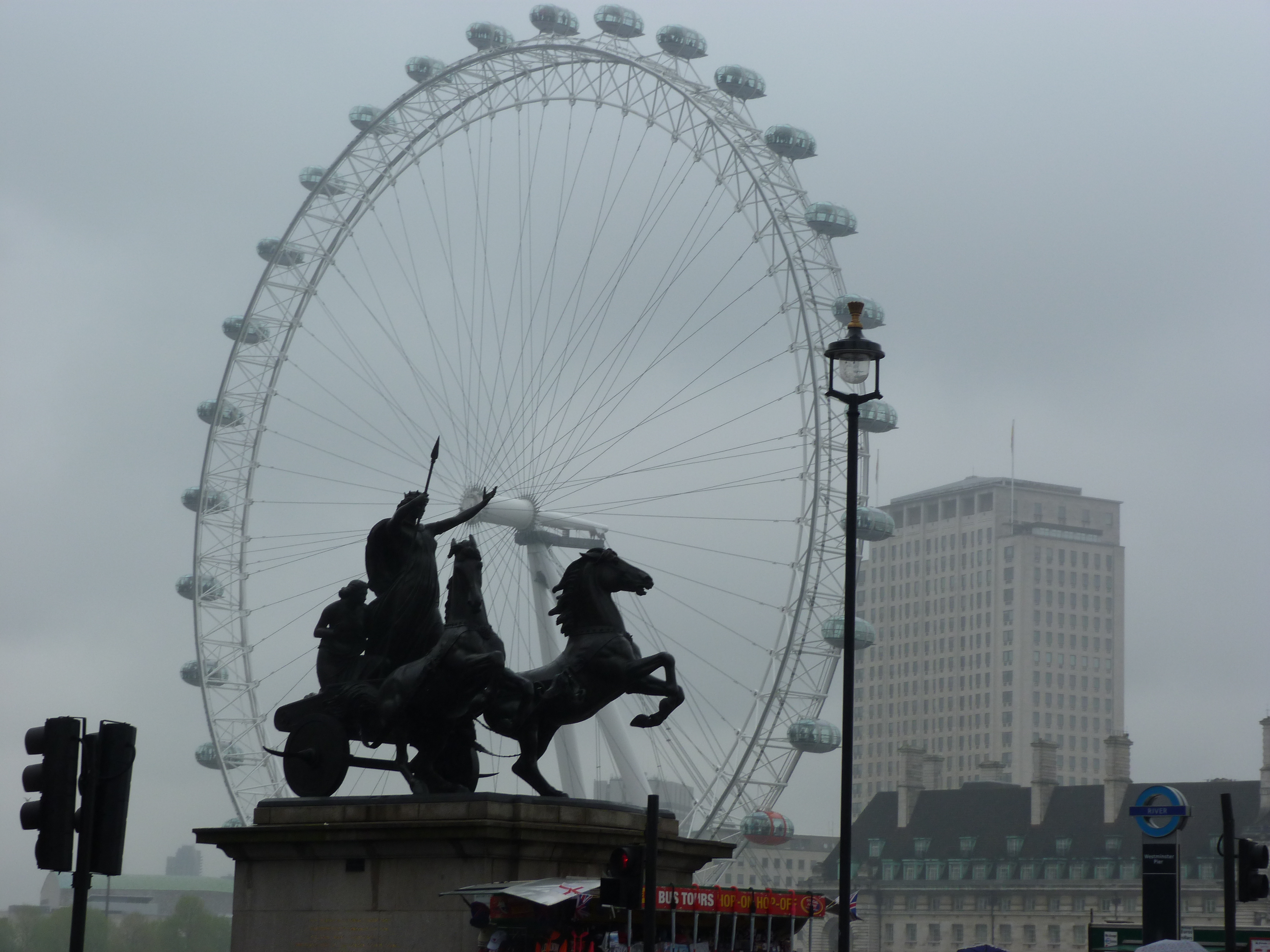 El London Eye es una gran noria situada en el South Bank del río Támesis en Londres, Reino Unido. Es la noria más alta de Europa7​ y la atracción turística más popular del Reino Unido. La escultura que aparece es llamada "Boudica y sus hijas".