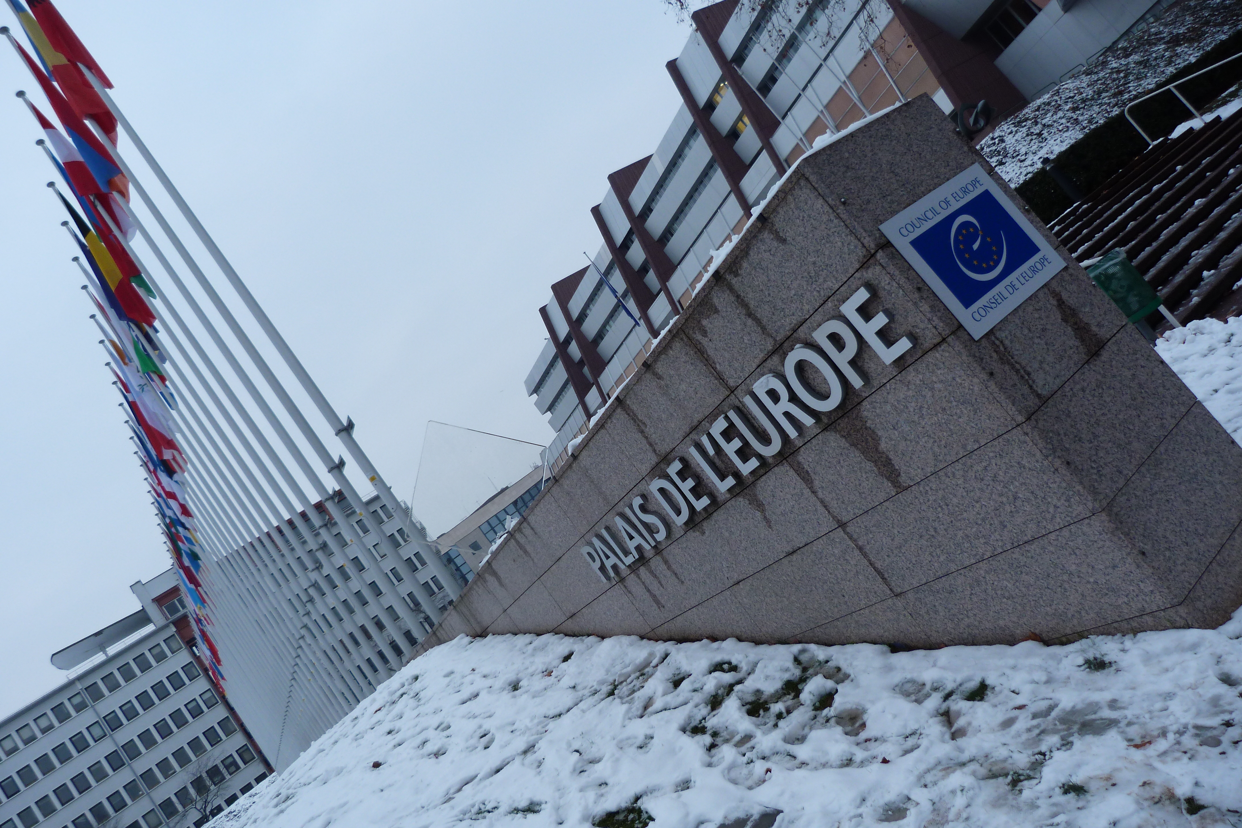 Letras y banderas del parlamento europeo en Estrasburgo
