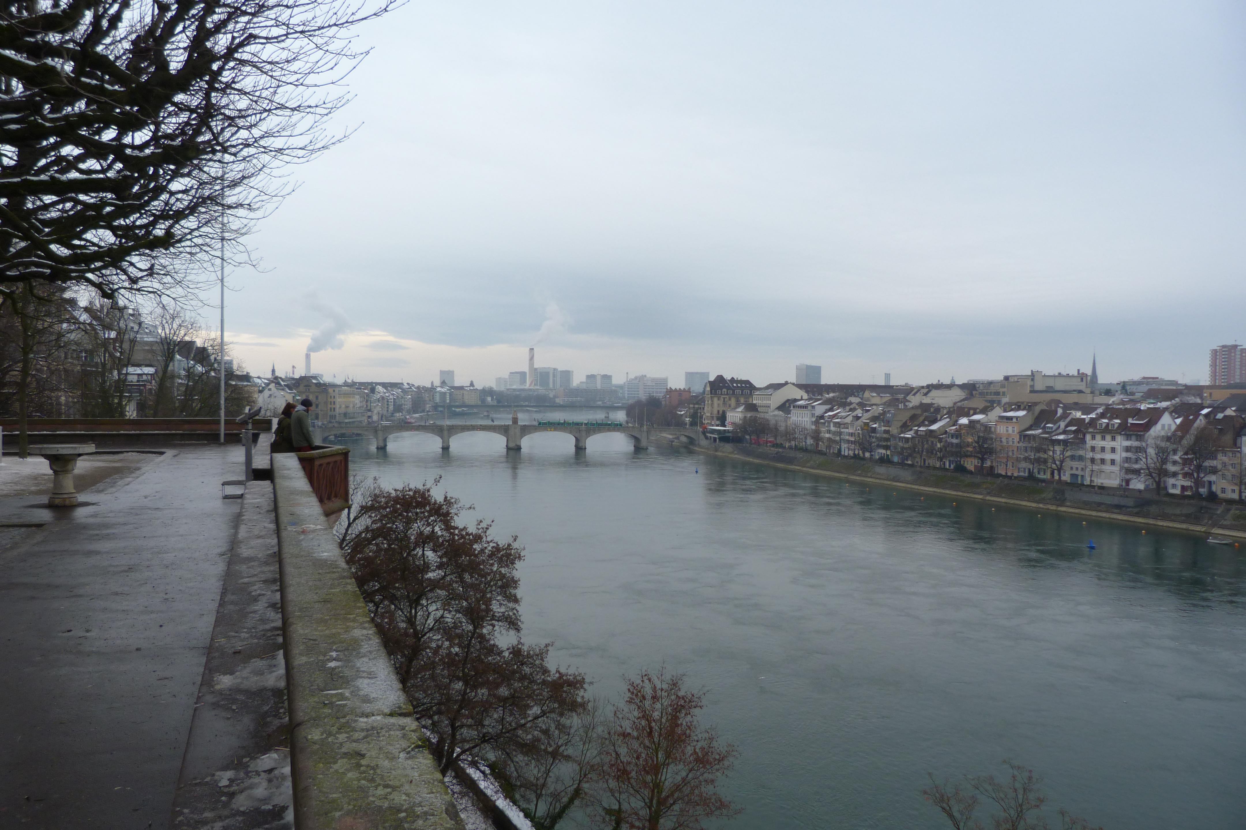 El río Rin a su paso por Basilea, Suiza y un puente a lo lejos