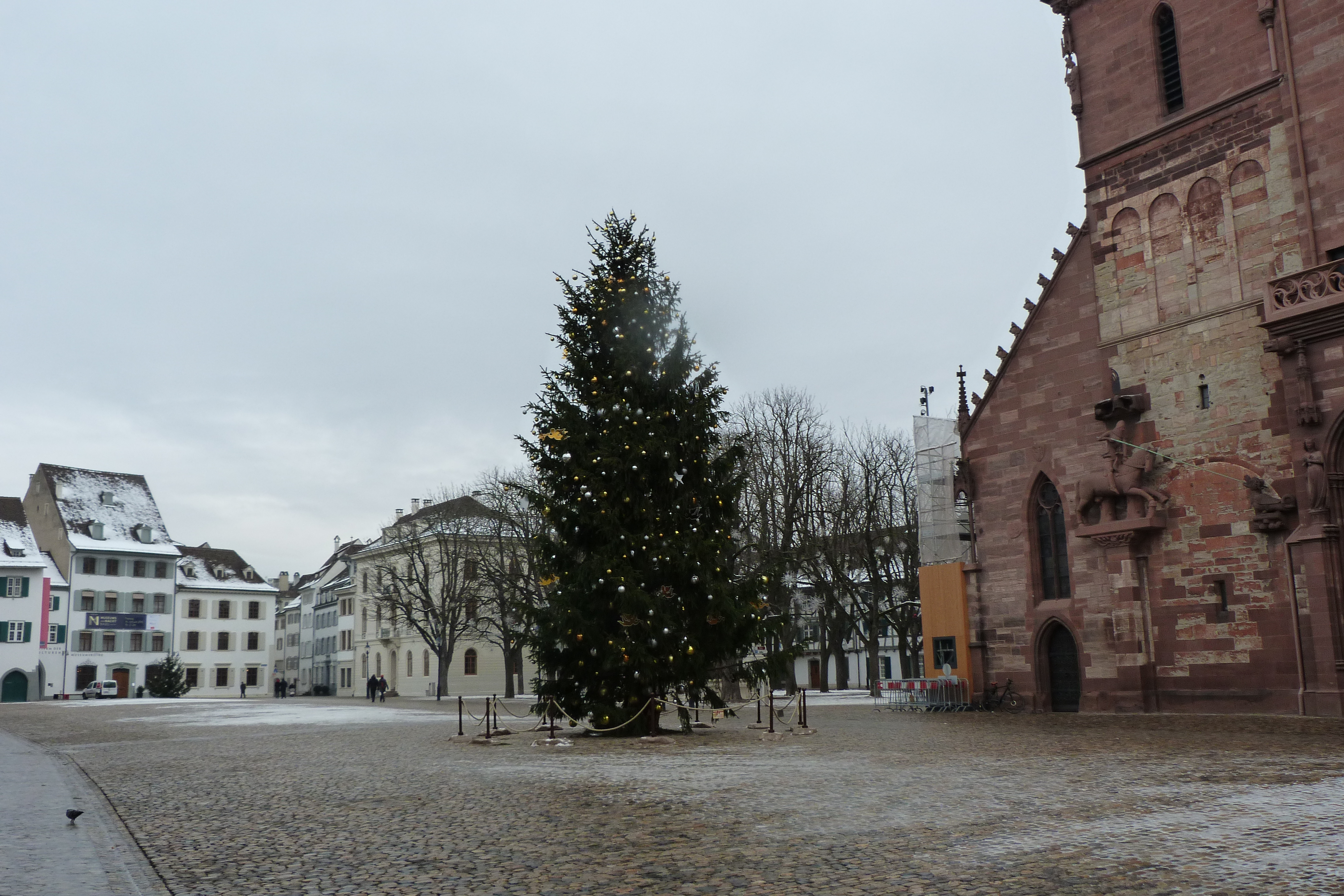 Paisaje navideño de la plaza frente a la catedral de Basilea. Árbol de navidad y nieve.
