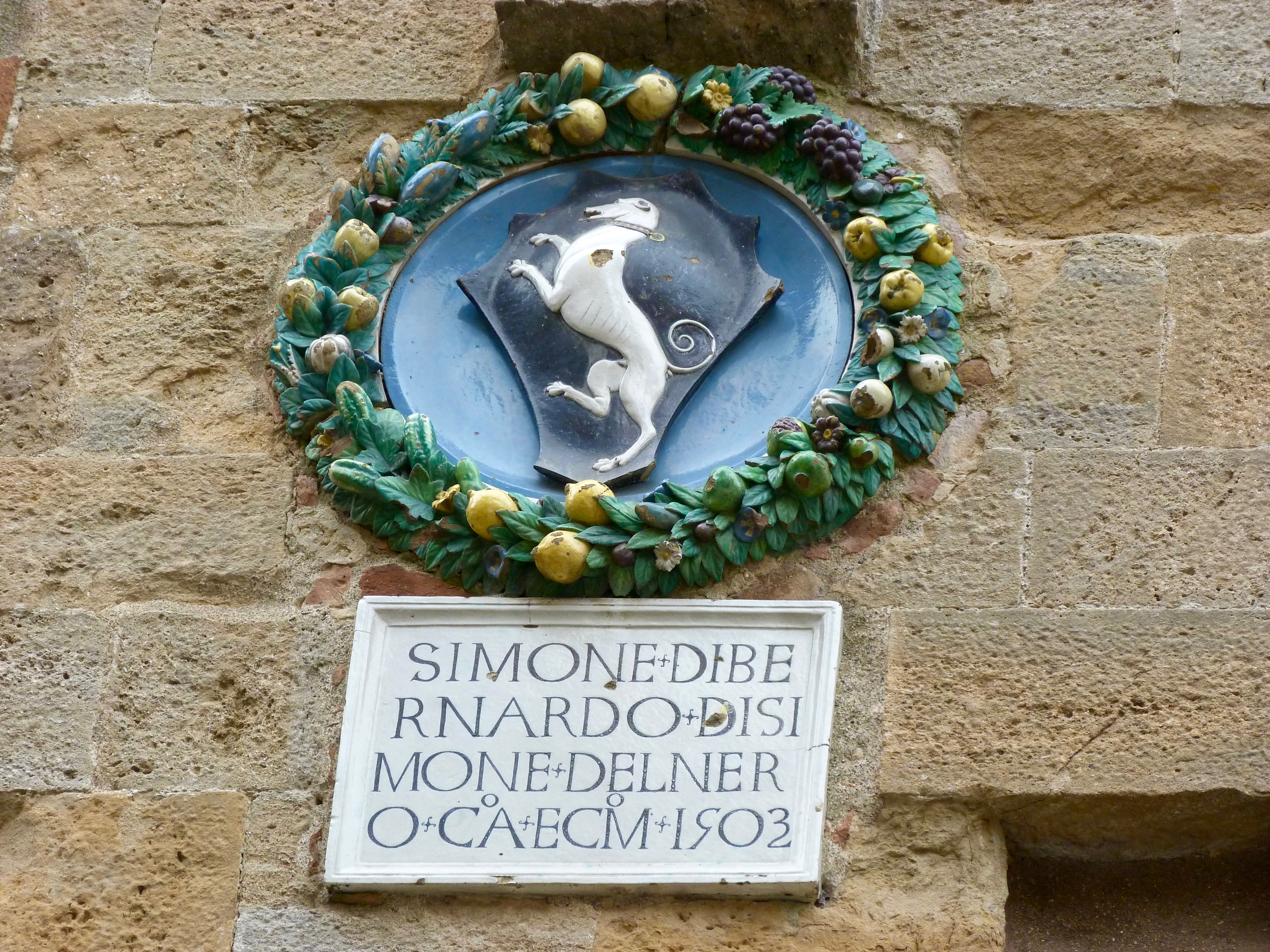 Escudo sobre cerámica vidriada de Della Robbia en la fachada del palacio de la Señoría de Volterra.
