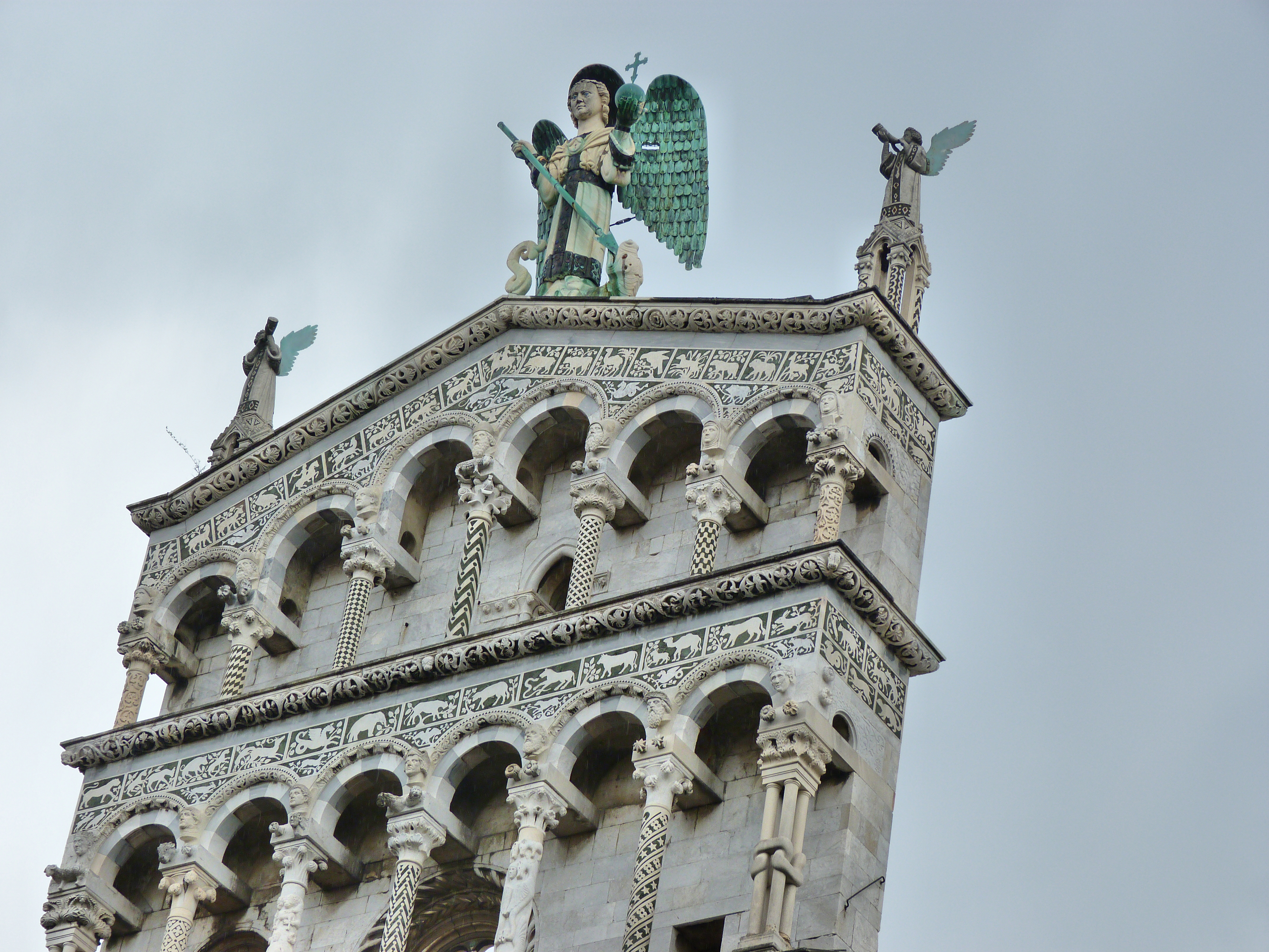 Ángel en la Iglesia de San Miguel en Foro.La Iglesia de San Miguel en Foro (en italiano: Chiesa di San Michele in Foro) es una iglesia católica de la ciudad de Lucca, Toscana, Italia central, construida sobre el antiguo foro romano. Se encuentra en la plaza de San Miguel (Piazza San Michele), sobreelevada rodeada por columnas de mármol conectadas por cadenas de metal y está flanqueada por una hilera de edificios medievales. En esta plaza se encuentra también una estatua en honor de Francisco Burlamacchi.