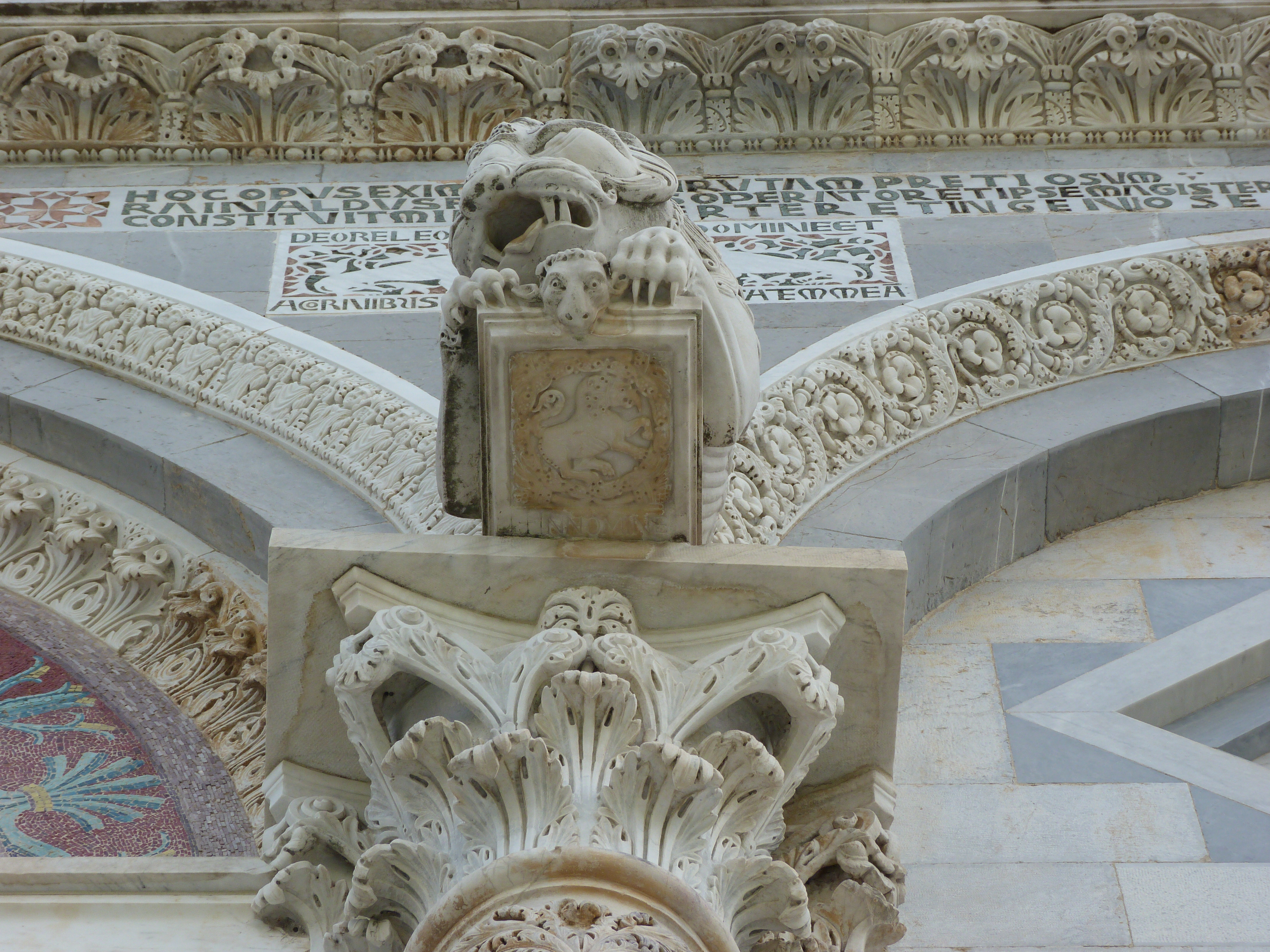 Gárgola talla en la catedral de Pisa. La catedral de Santa María Asunta (en italiano: Cattedrale Metropolitana Primaziale di Santa Maria Assunta; Duomo di Pisa), en el centro de la Piazza dei Miracoli es una catedral católica medieval dedicada a la Asunción de la Virgen, sede episcopal de la ciudad italiana de Pisa. Obra representativa del arte románico, en particular del románico pisano, muestra el testimonio tangible del prestigio y de la riqueza alcanzados por la república marinera de Pisa en el momento de su apogeo.