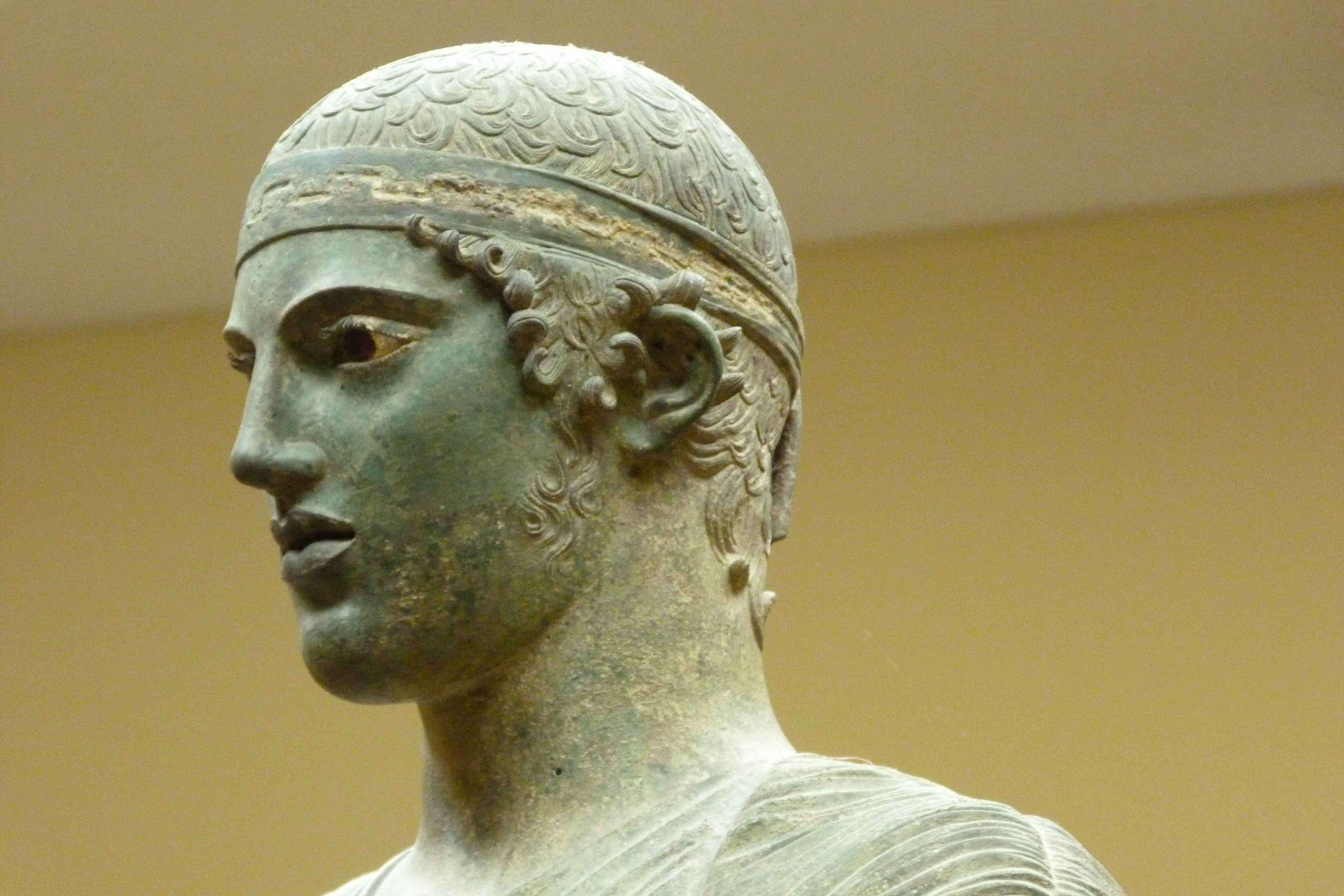 Rostro de perfil del Auriga de Delfos. Auriga de Delfos es la denominación historiográfica de una escultura griega del denominado estilo severo (transición entre la escultura arcaica y la clásica). Se realizó, en bronce, en el año 474 a. C., para conmemorar la victoria del tirano Polizalo de Gela en la carrera de cuadrigas de los Juegos Píticos (los que se celebraban en honor de Apolo en el santuario de Delfos). La figura formaba parte de un grupo más amplio, del que sólo quedan fragmentos de cuatro o seis caballos y un pequeño esclavo que se situaría ante ellos. Todo ello fue hallado en 1896 durante unas excavaciones en ese mismo lugar arqueológico. En la actualidad se expone en el Museo Arqueológico de Delfos.