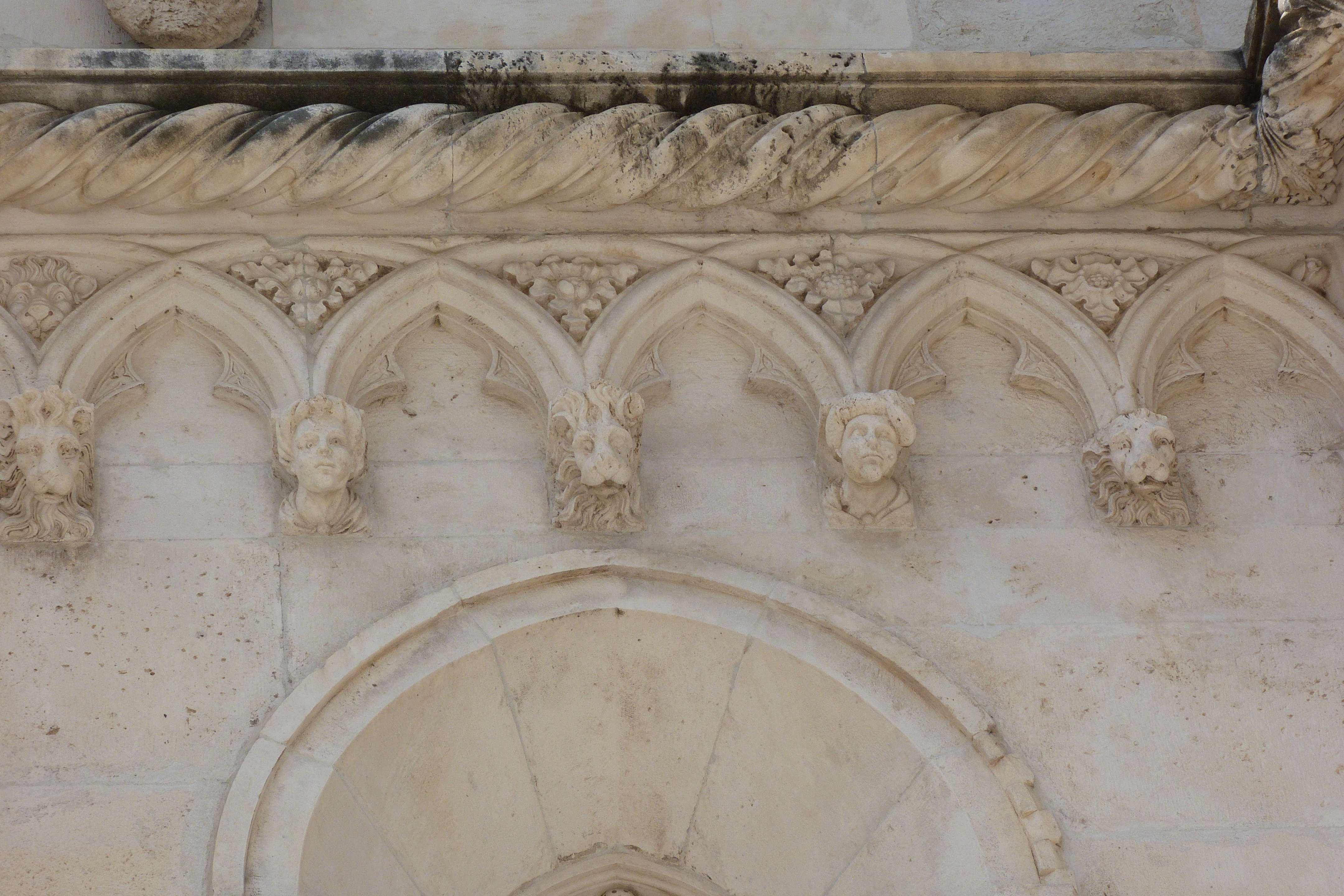 Detalle decorativo de arcadas góticas y canecillos en la catedral de San Jacobo en Sibenik