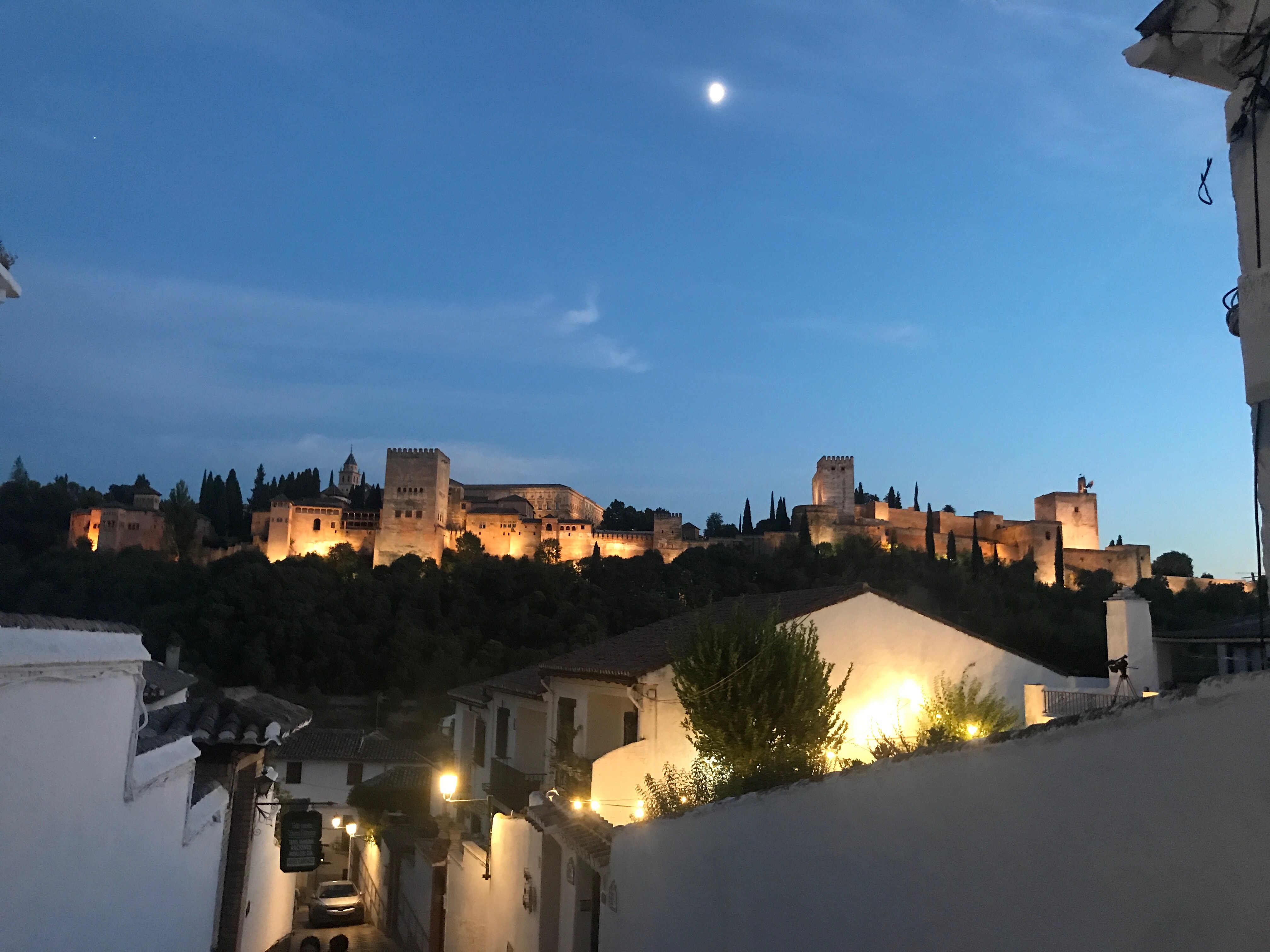 Alhambra iluminada. La Alhambra es un complejo monumental sobre una ciudad palatina andalusí situada en Granada, España. Consiste en un conjunto de antiguos palacios, jardines y fortalezas inicialmente concebido para alojar al emir y la corte del reino Nazarí, más tarde como residencia de los reyes de Castilla y de sus representantes