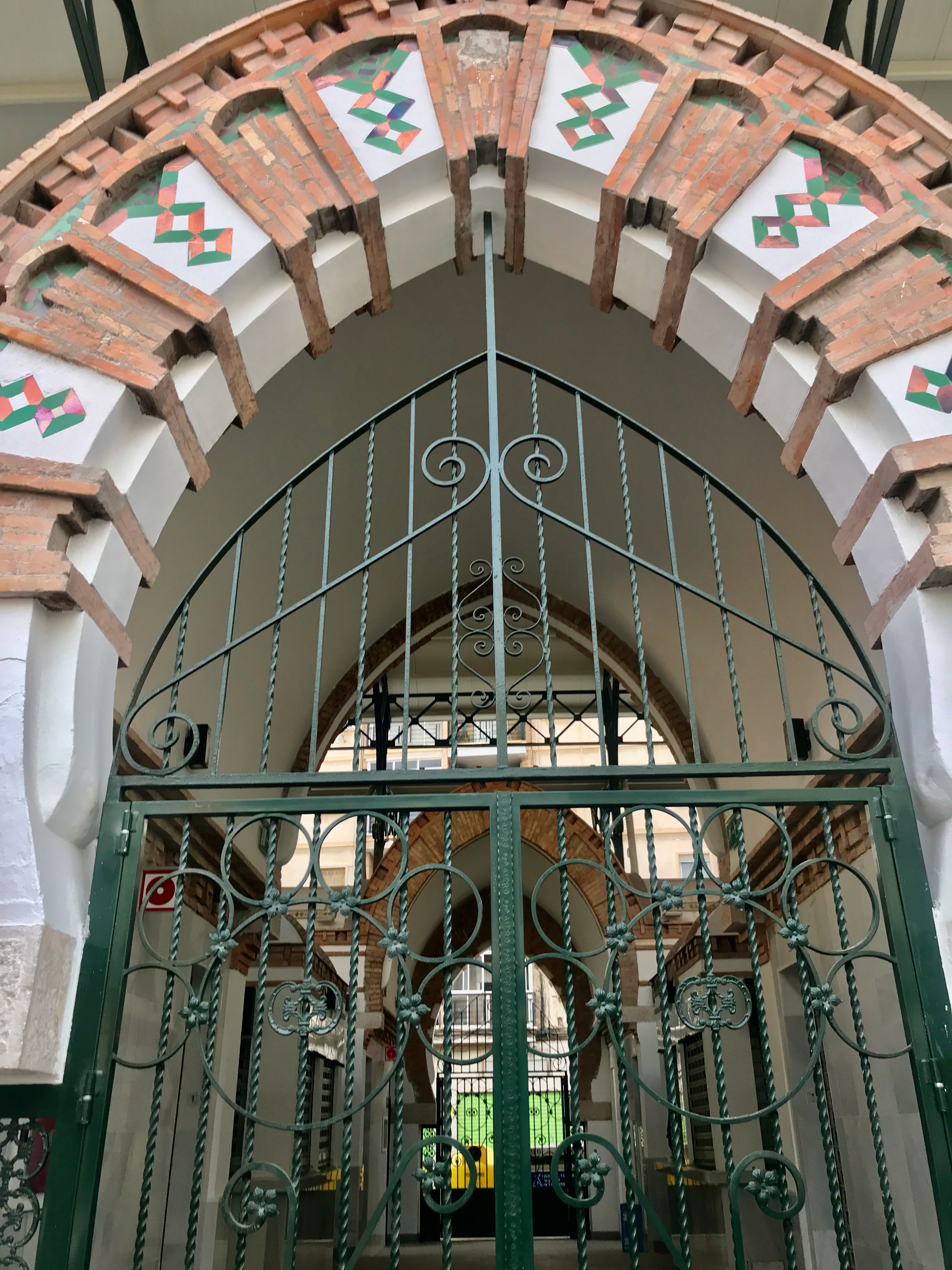 Arco del Mercado de Salamanca de Málaga. Se trata de un edificio de estilo neomudéjar de una sola nave con portadas idénticas a ambos lados y cubierta por una estructura metálica. En las portadas se encuentra casi toda la decoración, de inspiración exótica. Consisten en un arco de herradura formado por bandas de ladrillo en distintas disposiciones y rejas modernistas. El interior está cubierto de azulejos.