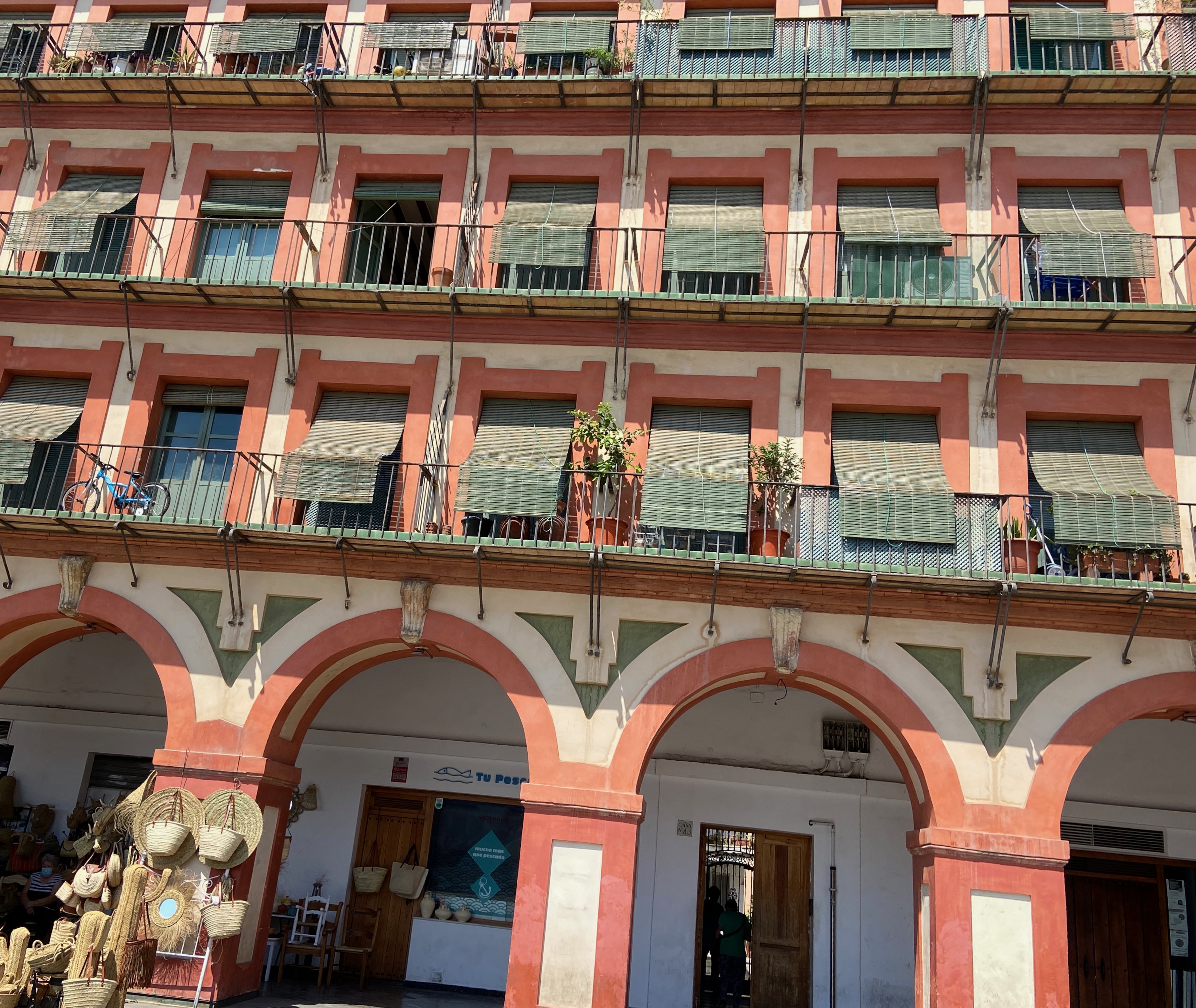 Plaza de la Corredera en Córdoba. La plaza de la Corredera es uno de los lugares más emblemáticos de la ciudad española de Córdoba. Es la única plaza mayor cuadrangular de Andalucía y se encuentra en el barrio histórico de la Axerquía. A pesar de que las primeras evidencias de una plaza irregular son del siglo xiv, la plaza actual fue construida en 1683 por el arquitecto Antonio Ramós Valdés por mandato del corregidor Francisco Ronquillo Briceño. Su nombre proviene de las corridas de toros que se celebraban en este espacio, aunque también se celebraron autos de fe y ejecuciones de la Inquisición española