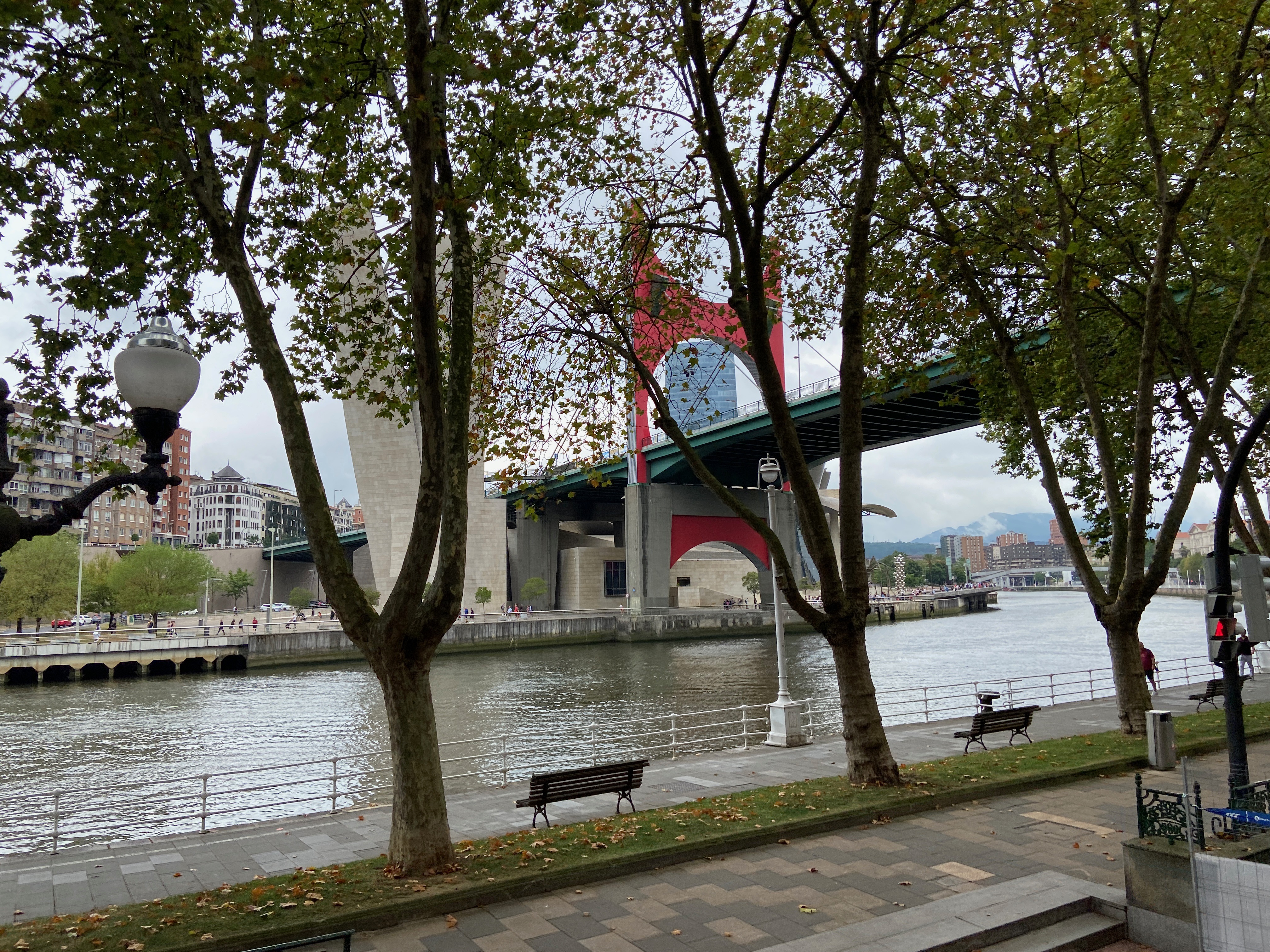Ría de Bilbao con el puente Salbeko Zubia y parque con árboles.
