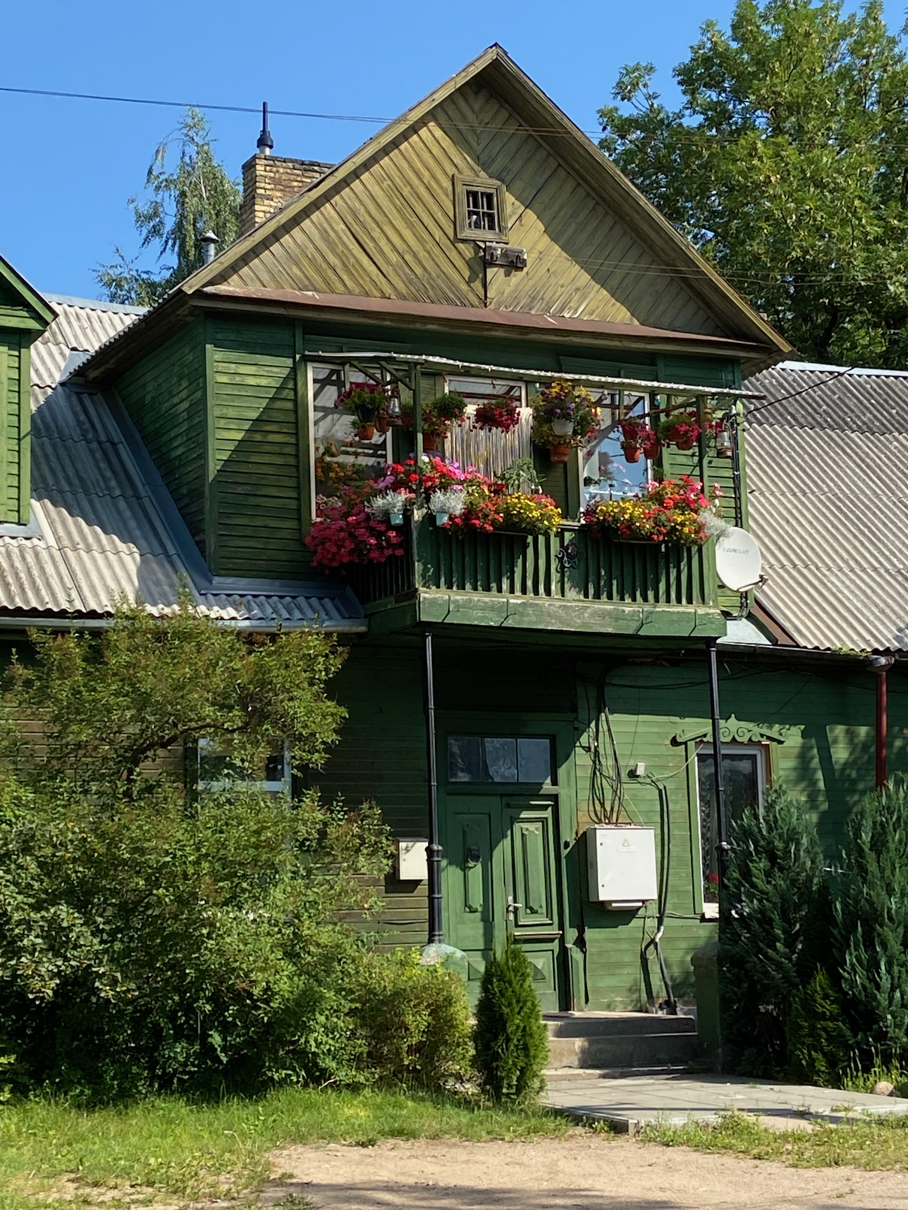 Vivienda de la ciudad de Vilnius con macetas colgando.