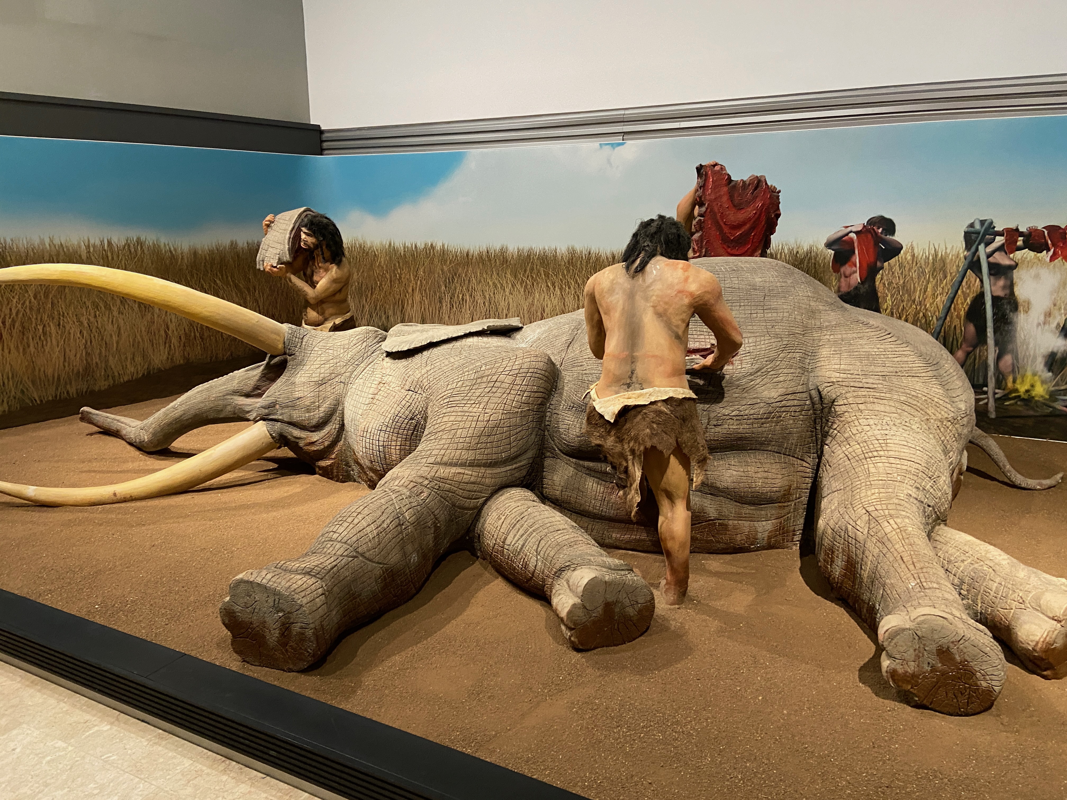 Escena de prehistoria en una de las salas del museo de paleontología de Cuenca. Hombres y mujeres preparando las pieles y carnes tras la caza.
