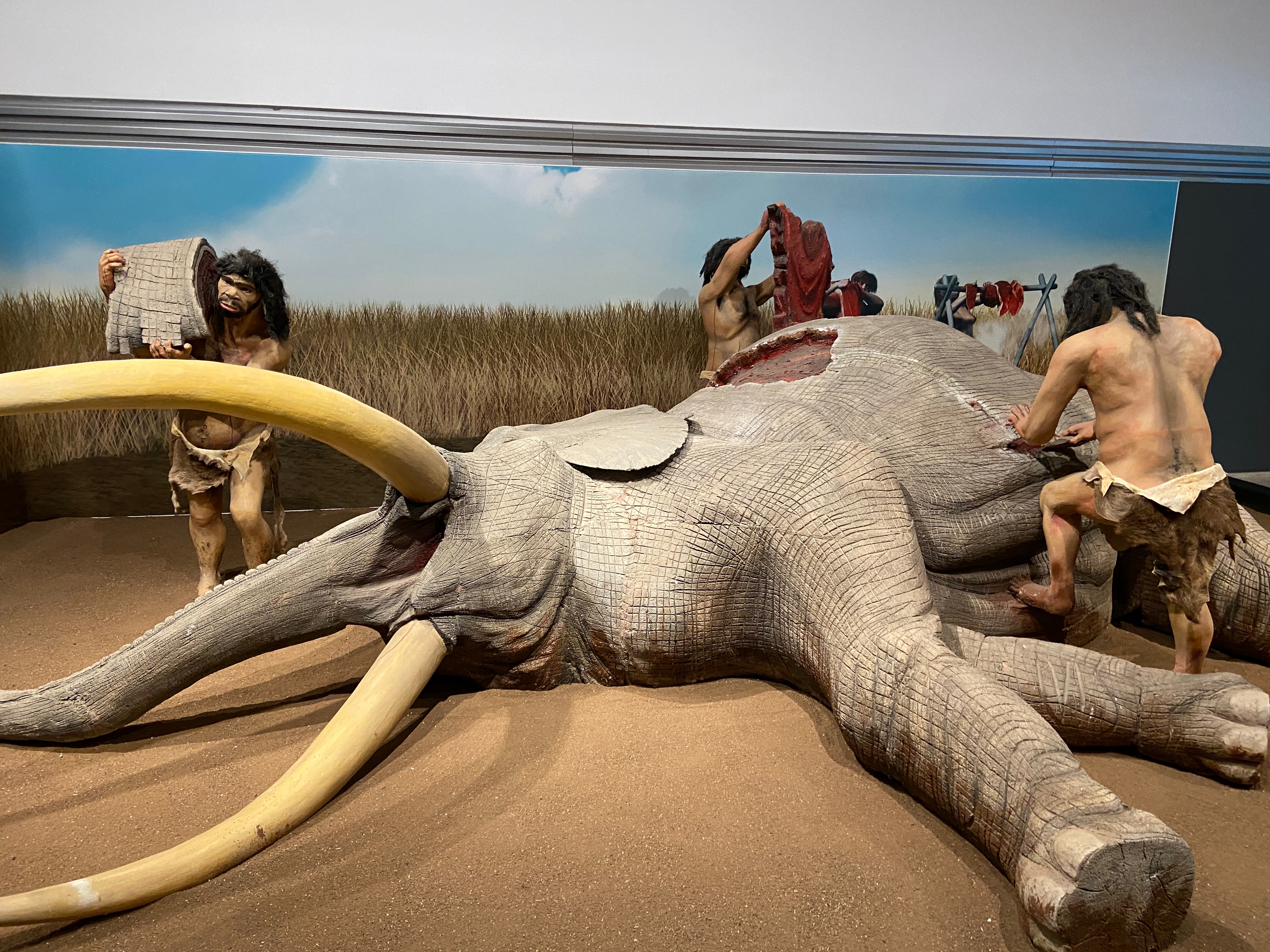 Escena de prehistoria en una de las salas del museo de paleontología de Cuenca. Hombres preparando las pieles y carnes tras la caza.