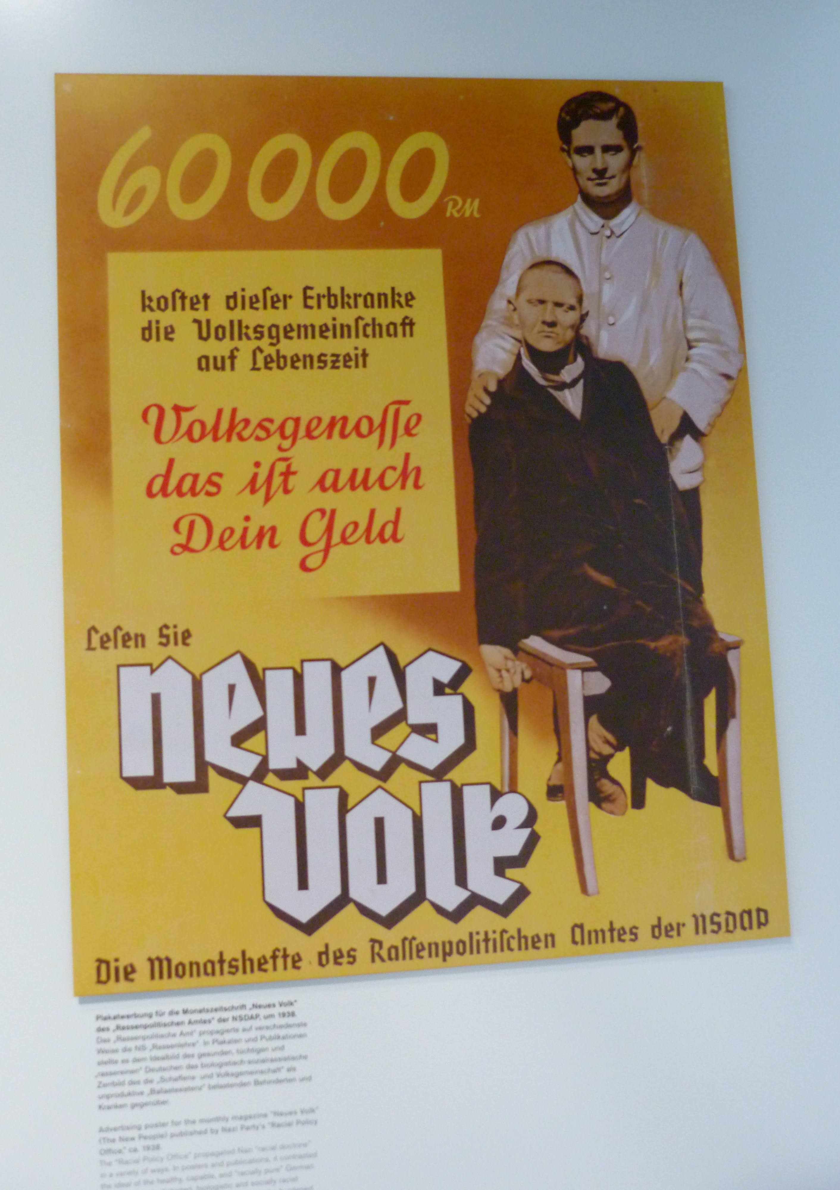 En la imagen aparece la frase «vida indigna de ser vivida» (en alemán: Lebensunwertes Leben; literalmente «vida indigna de la vida») fue un término utilizados por los nazis para identificar a segmentos de la población que, según el régimen nazi, no tenían derecho a vivir. Esas personas fueron asesinadas sistemáticamente por el estado bajo el pretexto de eutanasia, generalmente a través de la compulsión o el engaño de sus cuidadores. El término incluía personas con problemas médicos graves y personas consideradas muy inferiores según la política racial de la Alemania Nazi. Este concepto formó un componente importante de la ideología del nazismo y en algún momento ayudó a conducir al Holocausto.1