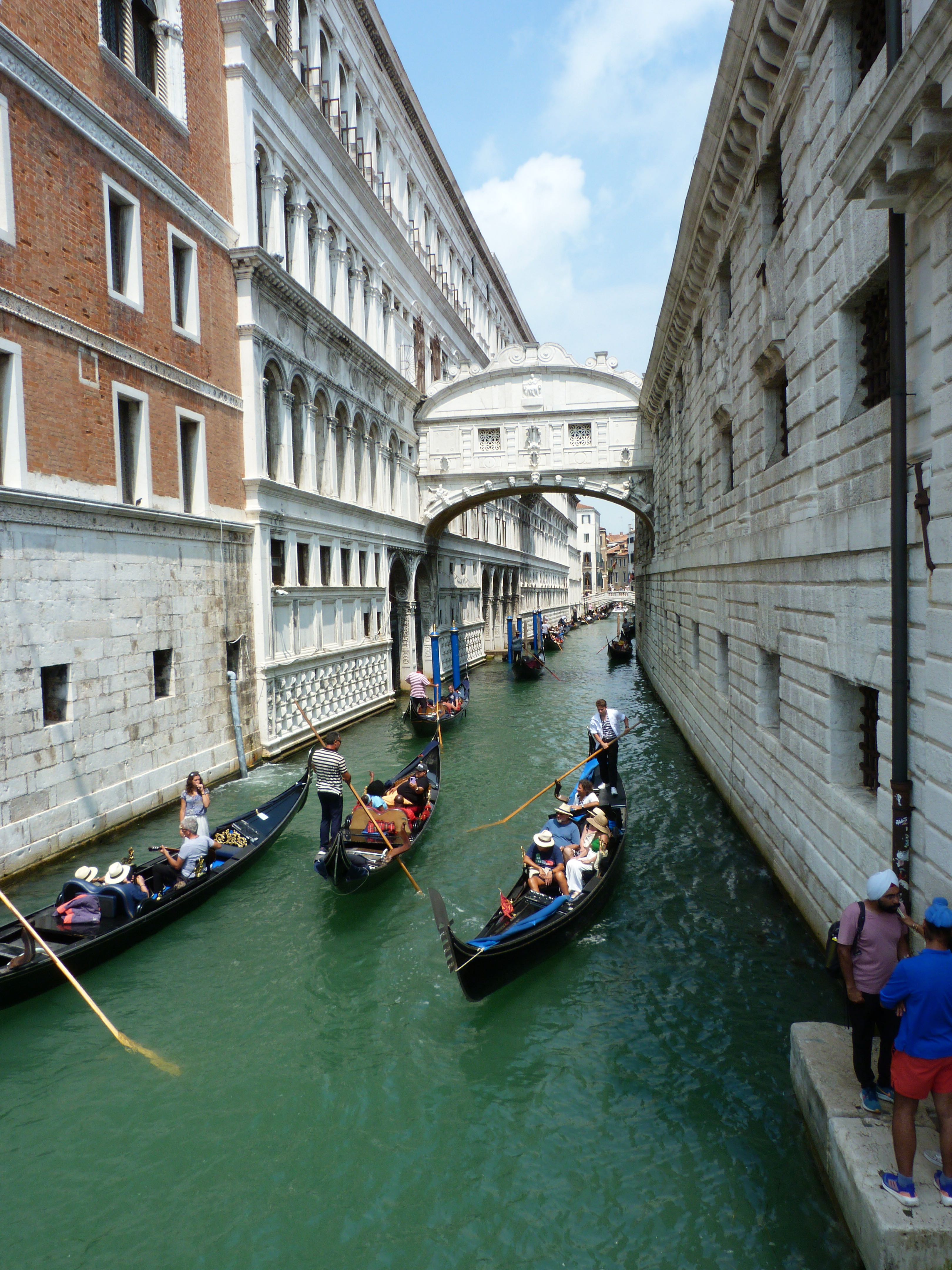 Puente de los suspiros en Venecia y turistas en góndolas.