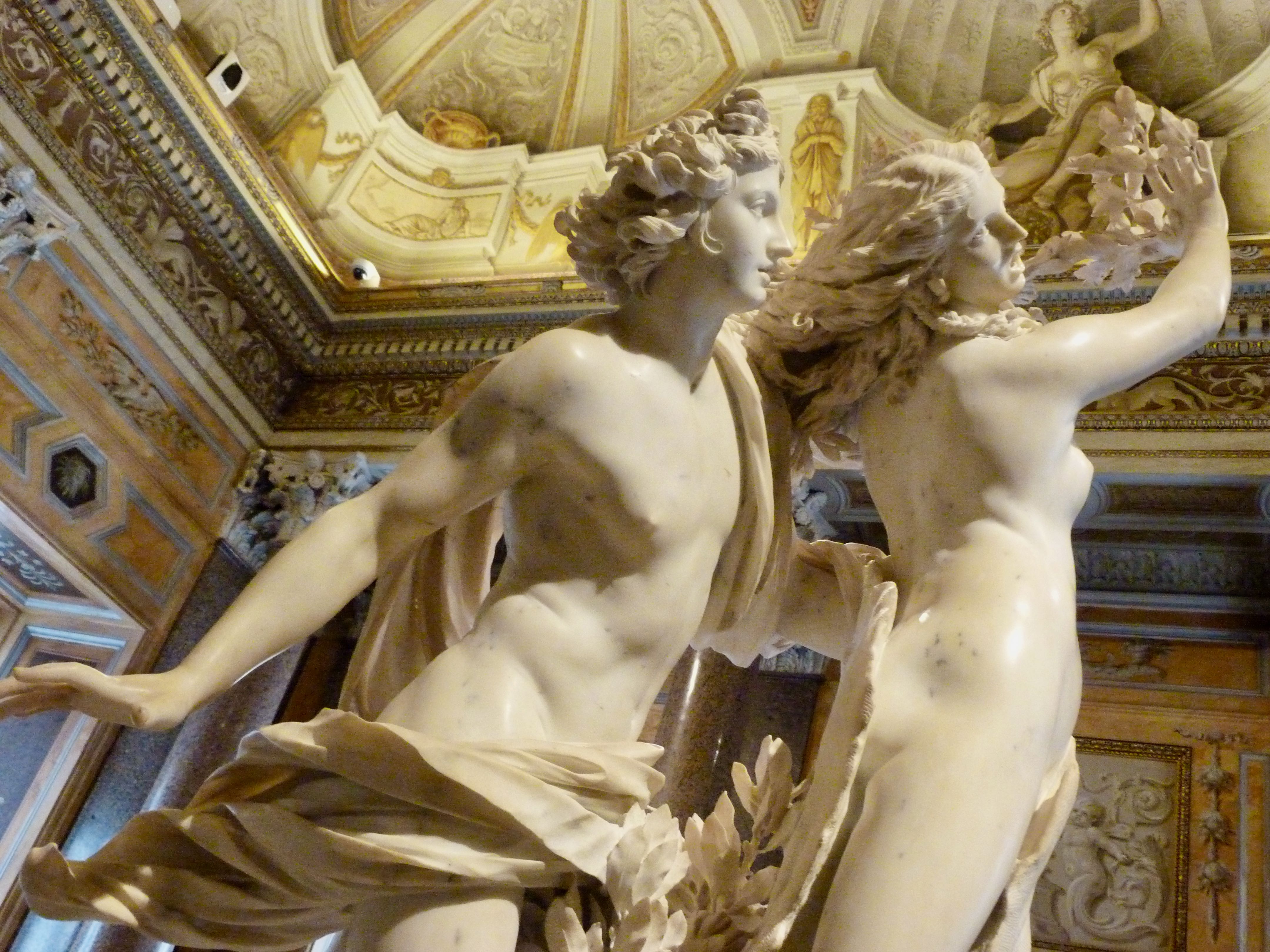 Grupo escultórico Apolo y Dafne de Gian Lorenzo Bernini en la galería Borghese. En ella se puede advertir a Apolo alcanzando a Dafne mientras ella intenta escapar. Apolo está coronado con una corona de laurel que presagia la metamorfosis de Dafne en árbol de laurel. Dafne es retratada durante el proceso de transformación, de hecho sus brazos están tomando la forma de ramas mientras huye e implora a su padre que la rescate de Apolo