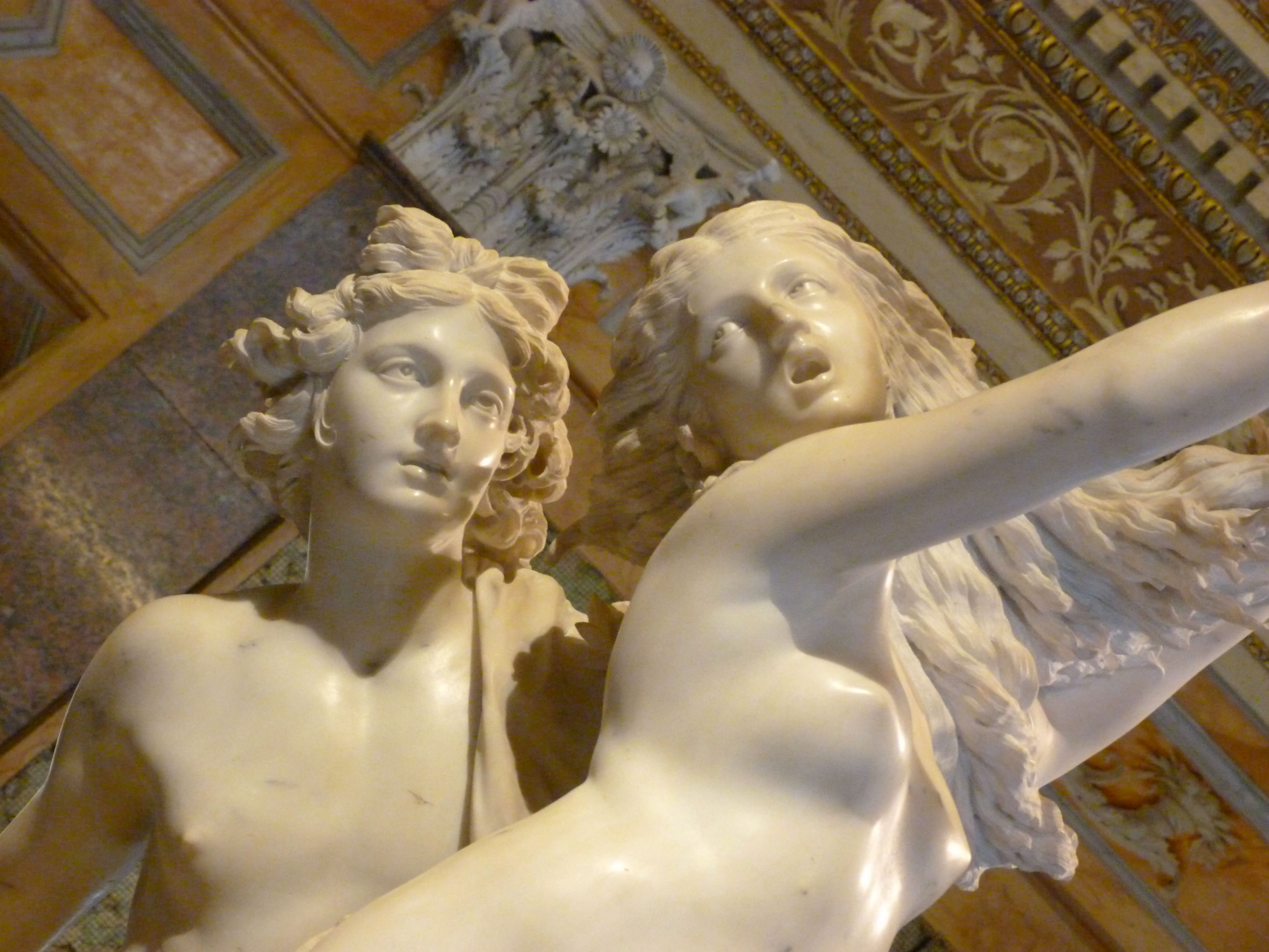 Grupo escultórico Apolo y Dafne de Gian Lorenzo Bernini en la galería Borghese. En ella se puede advertir a Apolo alcanzando a Dafne mientras ella intenta escapar. Apolo está coronado con una corona de laurel que presagia la metamorfosis de Dafne en árbol de laurel.