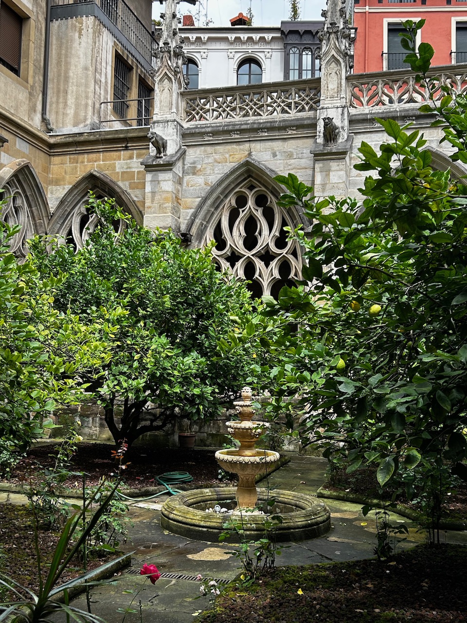 Vista del patio y fuente del claustro de la Catedral Basílica de Santiago en Bilbao.
