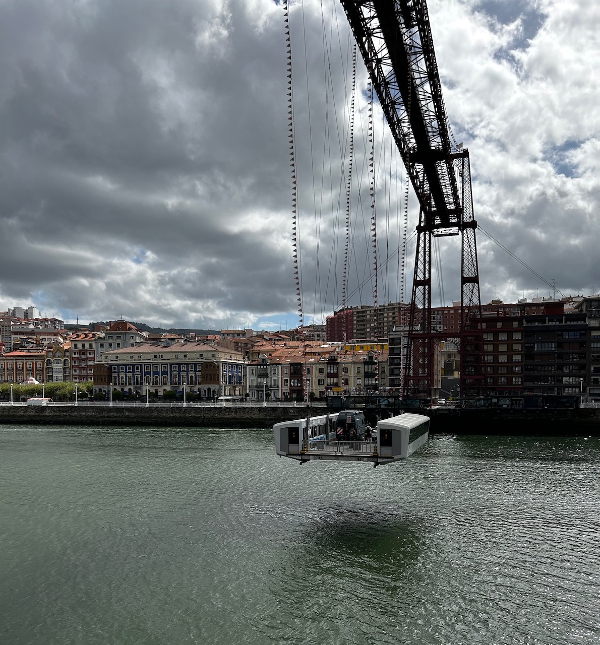 Vista del Puente de Vizcaya, también conocido como Puente Bizkaia, Puente colgante, Puente de Portugalete, o Puente colgante de Portugalete, es un puente transbordador de peaje, concebido, diseñado y construido por iniciativa privada entre 1887 y 1893, que une las dos márgenes de la ría de Bilbao en Vizcaya.