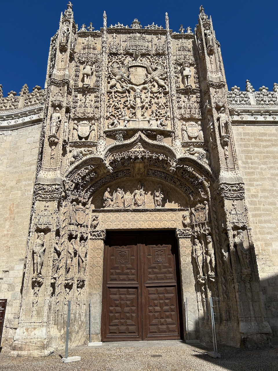 Fachada del Colegio de San Gregorio de Valladolid, sede principal del Museo Nacional de Escultura. Es uno de los mejores ejemplos de la arquitectura del periodo de los Reyes Católicos. La fachada se concibe como un telón o estandarte con arcos triunfales construidos con madera y elementos vegetales. En el tímpano principal y sobre el dintel decorado aparece la dedicatoria del creador del colegio Alonso de Burgos a San Gregorio Magno. Destacan las figuras de hombres silvestres cubiertos o no, de pelo, con garrotes y escudos de complicada interpretación. La parte central superior está ocupada por un pilón hexagonal, rebosante de agua y con un granado, que hace alusión a la fuente de la vida y al árbol de la ciencia. Aunque todo el relieve de la fachada simboliza el Paraíso al que deben dirigirse todos los hombres si hacen buen uso de las artes y la teología.