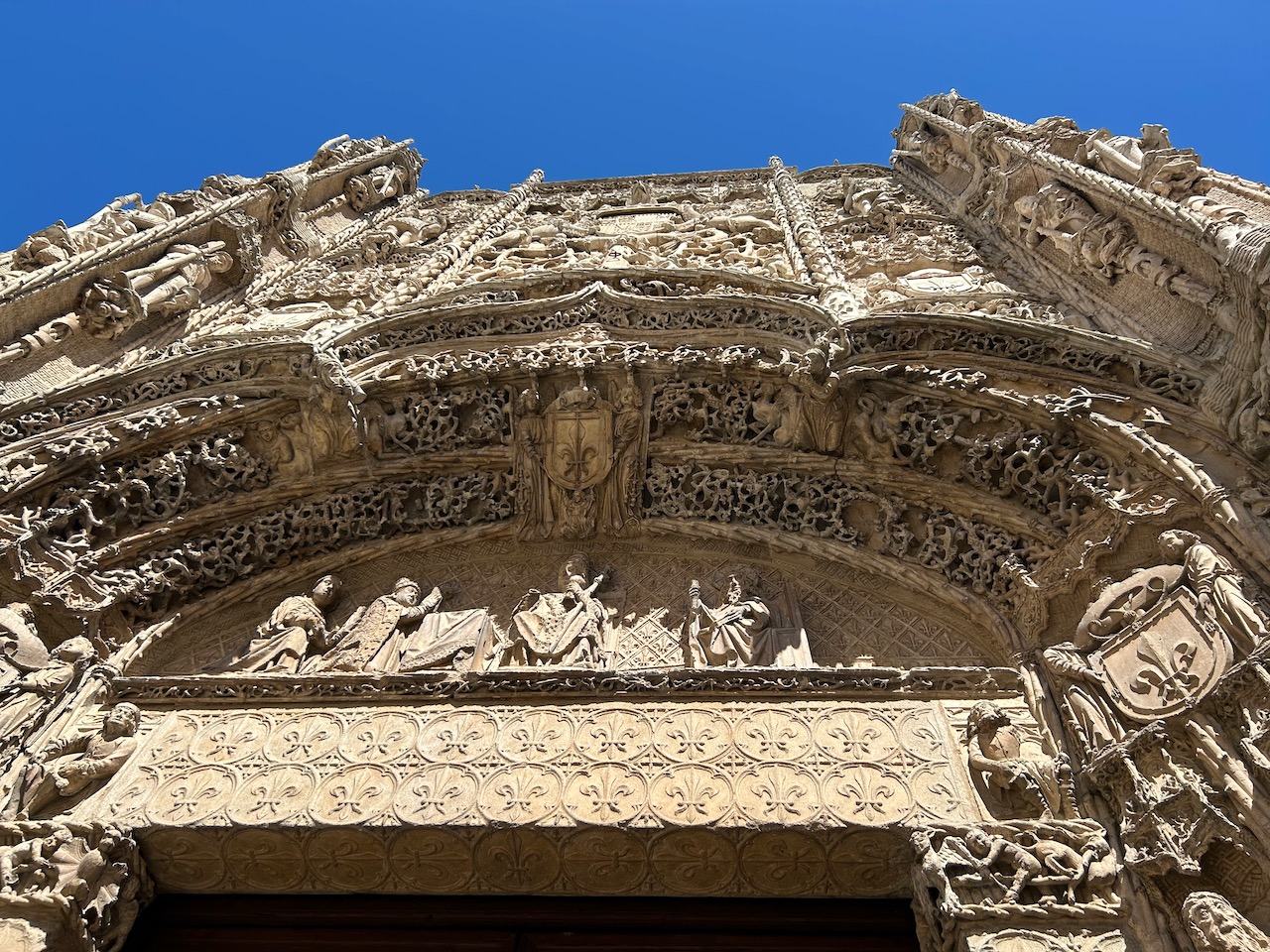 Plano contrapicado de la fachada del Colegio de San Gregorio de Valladolid. Se concibe como un telón o estandarte con arcos triunfales construidos con madera y elementos vegetales. En el tímpano principal y sobre el dintel decorado aparece la dedicatoria del creador del colegio Alonso de Burgos a S Gregorio Magno. Destacan las figuras de hombres silvestres cubiertos o no, de pelo, con garrotes y escudos de complicada interpretación. La parte central superior está ocupada por un pilón hexagonal, rebosante de agua y con un granado, que hace alusión a la fuente de la vida y al árbol de la ciencia. Aunque todo el relieve de la fachada simboliza el Paraíso al que deben dirigirse todos los hombres si hacen buen uso de las artes y la teología.