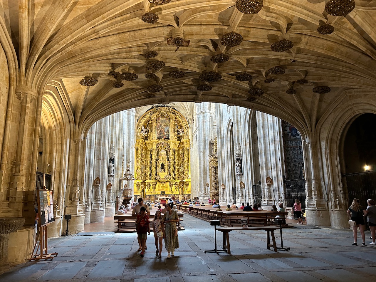 Interior del Convento de San Esteban de Salamanca. Vista de la nave de la iglesia, bóveda de crucería y retablo mayor de José Benito Churriguera, compuesto por un conjunto de esculturas y relieves que representa escenas religiosas y tallado en madera dorada. El retablo, en el que seis grandes columnas salomónicas, recubiertas de decoración vegetal, recorren el primer cuerpo, en cuyo centro se halla el tabernáculo central concebido como un templete, flanqueado por un par de columnas a cada lado. El segundo cuerpo queda rematado por una pintura de Claudio Coello cuyo tema es el martirio de San Esteban.
