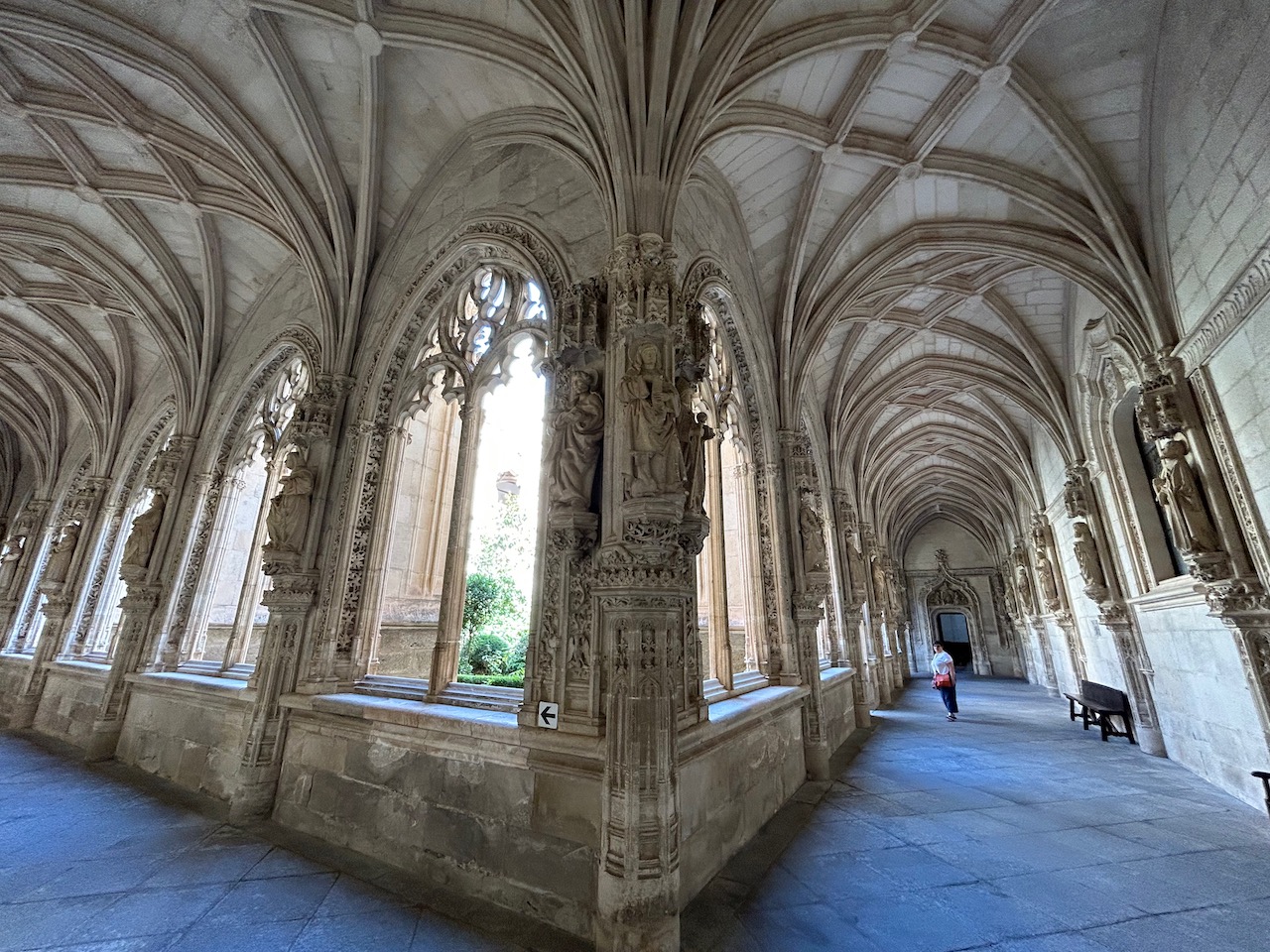 Es sin duda, el patio conventual gótico más bello de España. Obra de Guas, Simón de Colonia, Enrique y Antón Egas entre los siglos XV y XVI. Compuesto por cuatro alas abiertas a un patio a través de grandes ventanales de tracería flamígera, bordeados por un friso con decoración vegetal y animal. Con dos plantas bien diferenciadas tanto por el trazado de los vanos y su decoración, como por las cubiertas. La bóveda de este claustro bajo es de crucería, con la particularidad de que los nervios no se cruzan en las claves. Éstas quedan exentas, formándose rombos en la parte superior de la plementería. Nuevamente estamos ante un dato de mudejarismo, entroncando con la innovación califal de la bóveda de la maxura cordobesa de tiempos de al-Hakán II. Pero lo más destacado desde el punto de vista iconográfico es el muro, decorado con cenefas vegetales a modo de alfiz, dejando espacio para pinturas y esculturas.