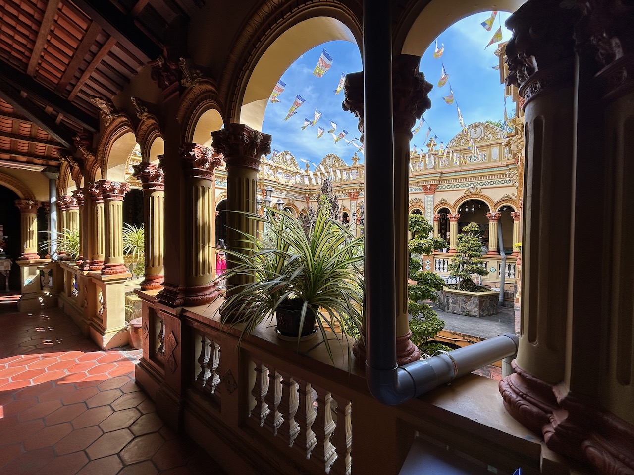 En la imagen podemos observar un ejemplo extraordinario de belleza arquitectónica en una de las múltiples pagadas que inundan el valle del Mekong, en la que se puede apreciar una mezcla importante de elementos occidentales y orientales, como tierra de fusión que fue, Vietnam.