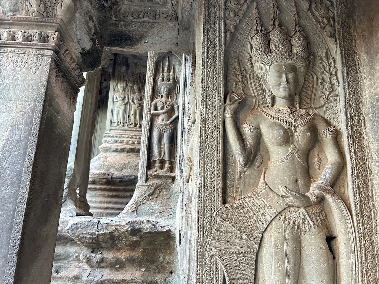 El templo de Angkor Wat es famoso por sus atractivas Apsaras (ninfas celestiales). Hay casi 2000 talladas en las paredes, cada una de ellas única, y lucen 37 tipos de peinados diferentes. Muchas de estas exquisitas tallas han sido dañadas tras siglos de contacto con la orina y los excrementos de los murciélagos.