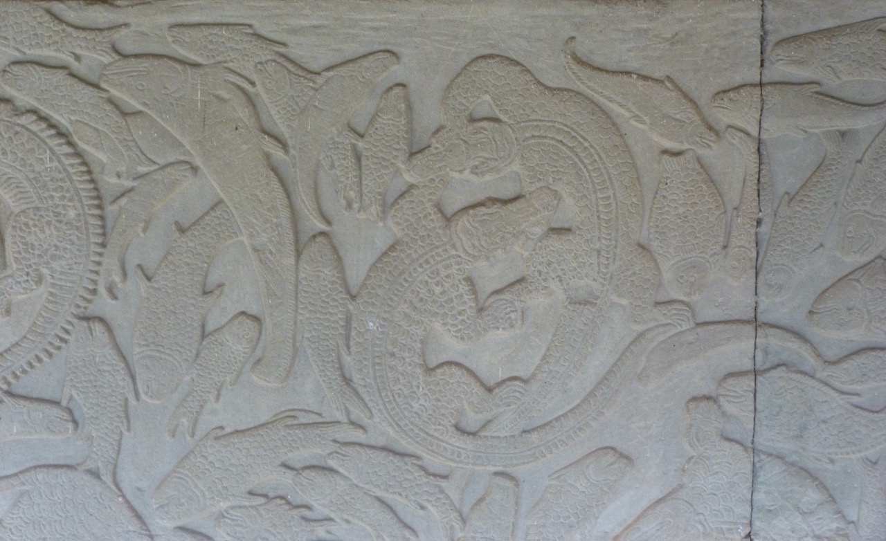 La sección sur de la galería oriental está decorada con la secuencia de bajorrelieves más famosa de Angkor Wat, conocida como Batido del Océano de Leche. Estas tallas ejecutadas con mano maestra representan a 88 asuras a la izquierda y a 92 devas con cascos crestados, que baten el océano para extraer el elixir de la inmortalidad. En la imagen representación de los cocodrilos.