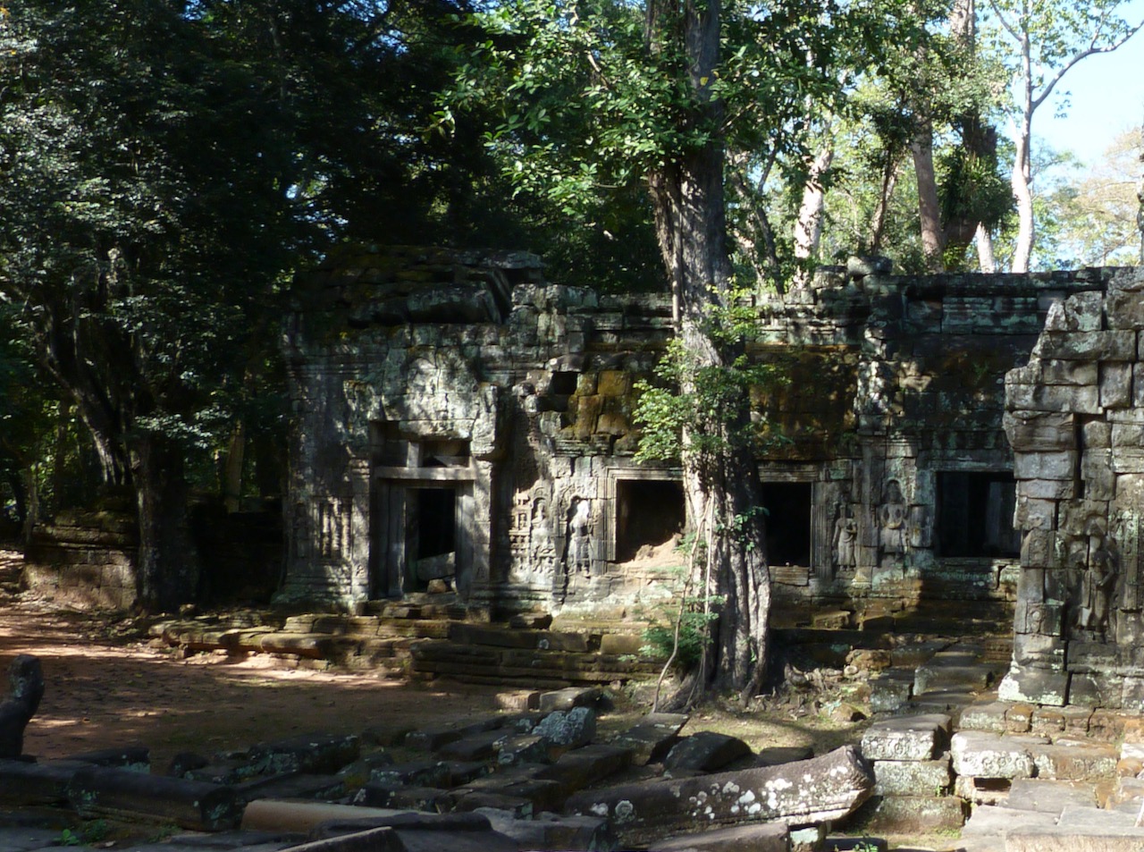 Si Angkor Wat es un testimonio del genio de los antiguos jemeres, Ta Prohm recuerda el increíble poder y fecundidad de la selva. Se trata de un templo budista dedicado a la madre de Jayavarman VII, empezado a construir en 1186 y originalmente se llamaba Rajavihara (Monasterio del Rey). Compuesto por torres, patios cerrados y estrechos corredores, muchos de ellos infranqueables al estar cubiertos por montañas de rocas desplazadas por las raíces de los árboles.