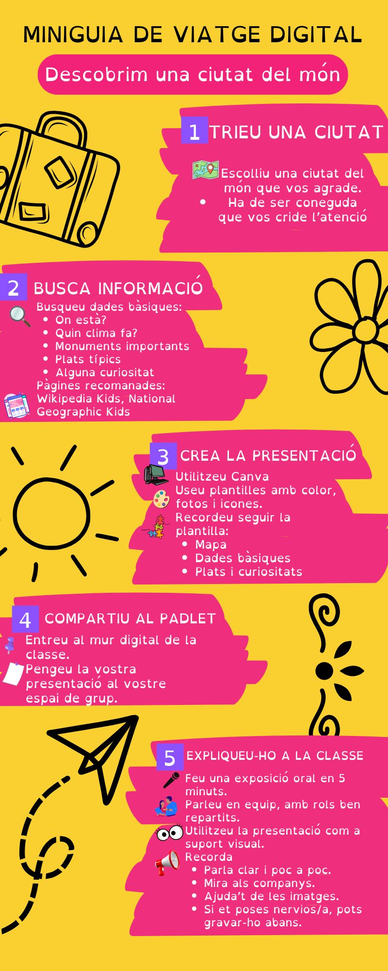 Activitat interdisciplinària i cooperativa en què cada grup tria una ciutat del món per investigar i crear una presentació digital (Canva) sobre aquesta ciutat. La informació s’organitza amb dades bàsiques, gastronomia i curiositats. El treball final es comparteix a través de Padlet i es fa una exposició oral breu davant la classe.